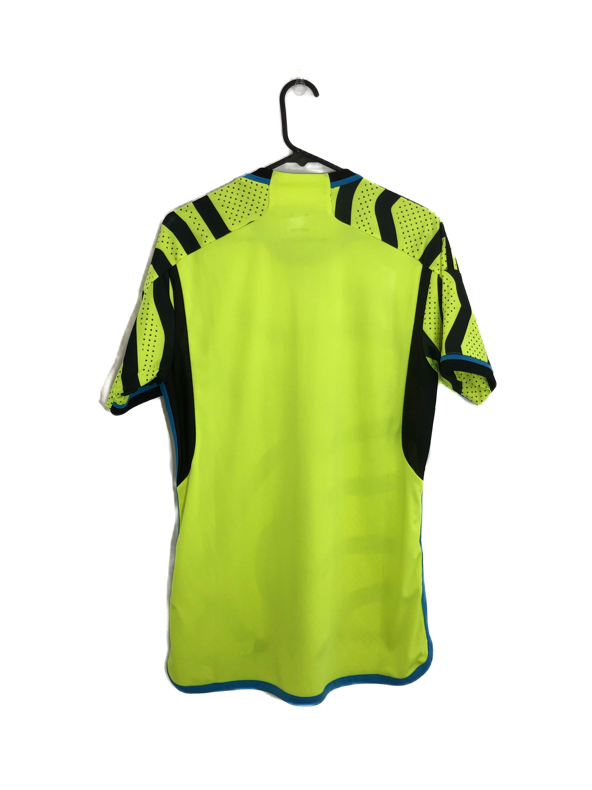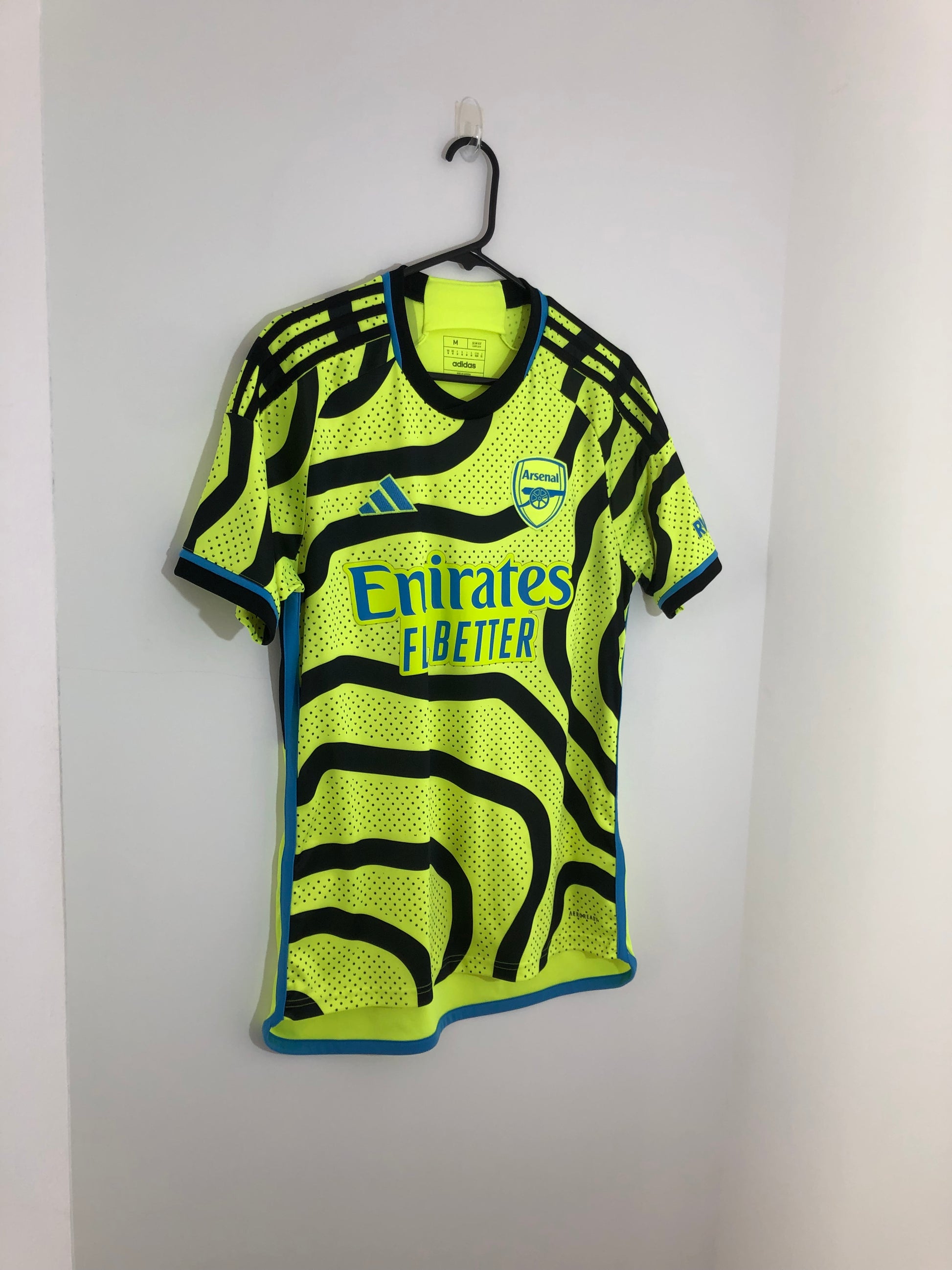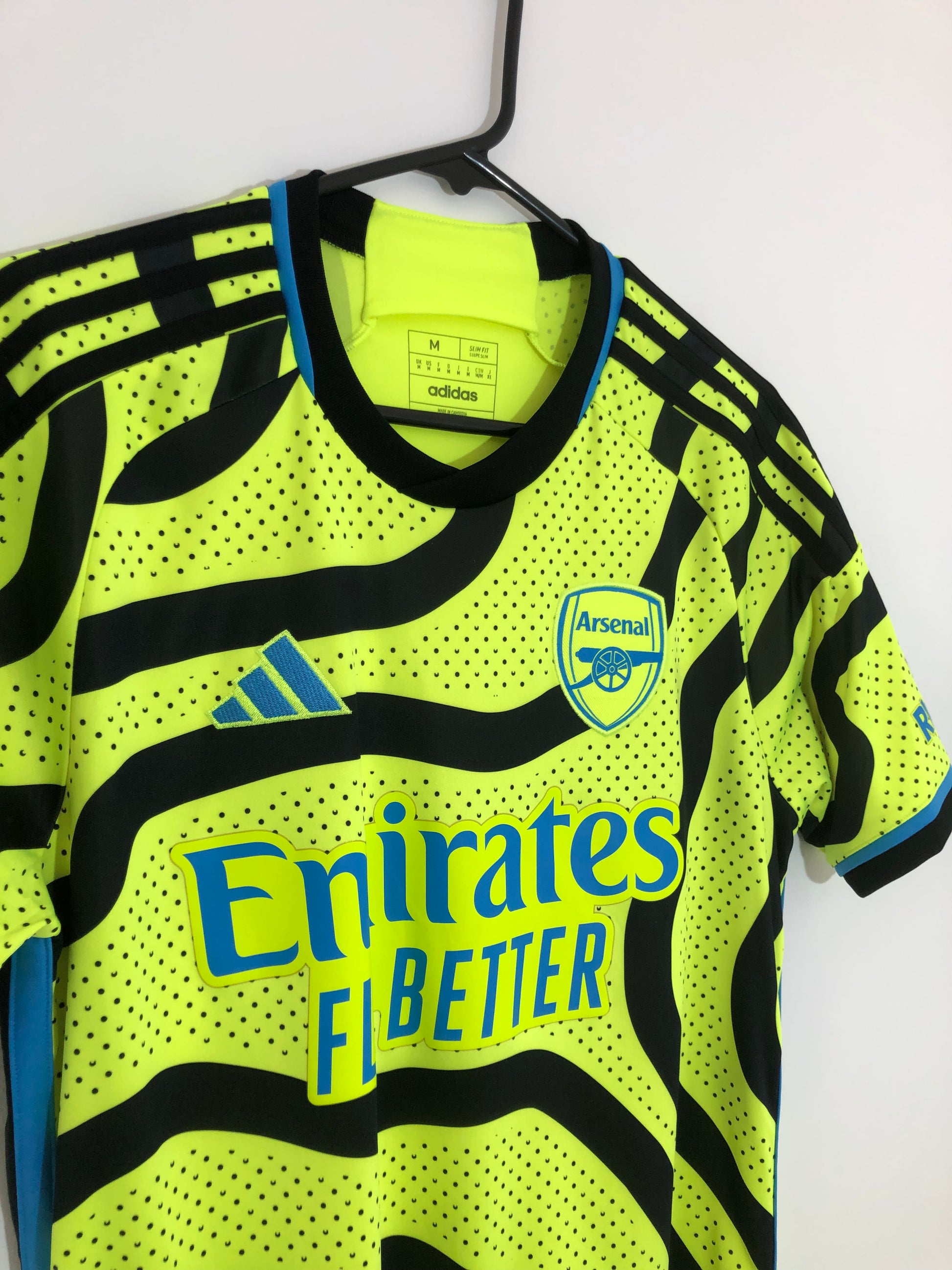 Show your support for Arsenal with this excellent condition 2023/24 away football shirt. The fluro yellow shirt features short sleeves and a loose fit, making it suitable for adults in a size medium. The shirt is made by Adidas and has a product code of HR6927, ensuring that you get a genuine item. This shirt has collar to hem measurements of 29 inches and pit to pit measurements of 20 inches. This shirt is suitable for wearing casually or at the match, so why not show your love for Arsenal by getting this shirt today.
