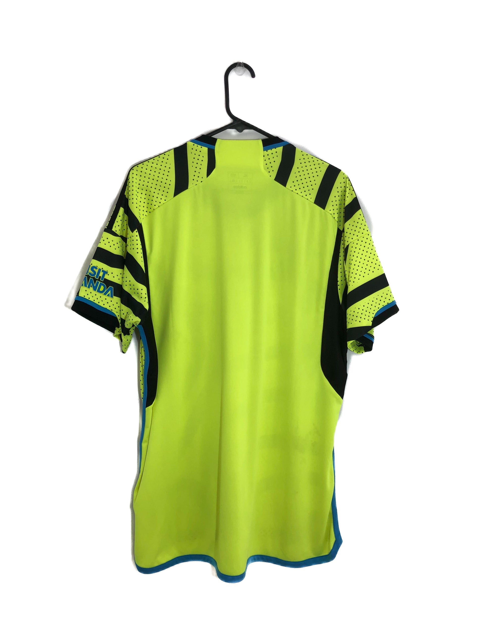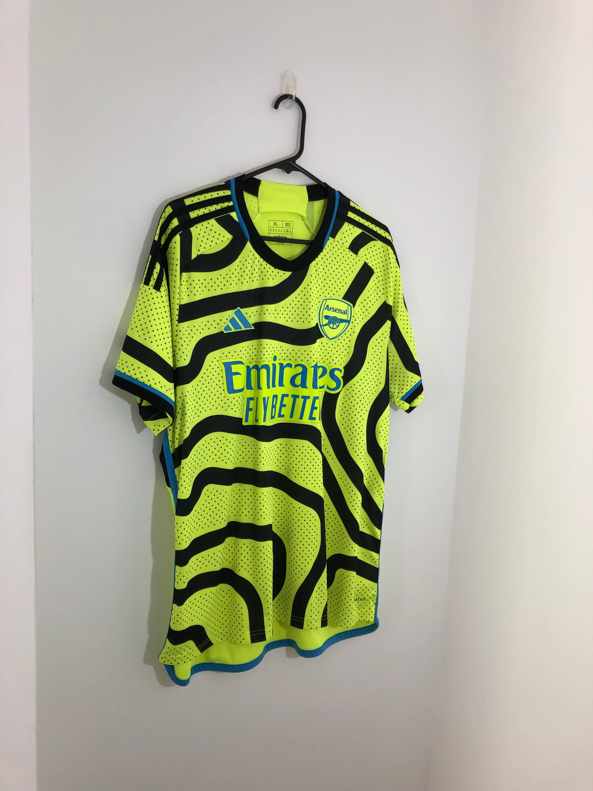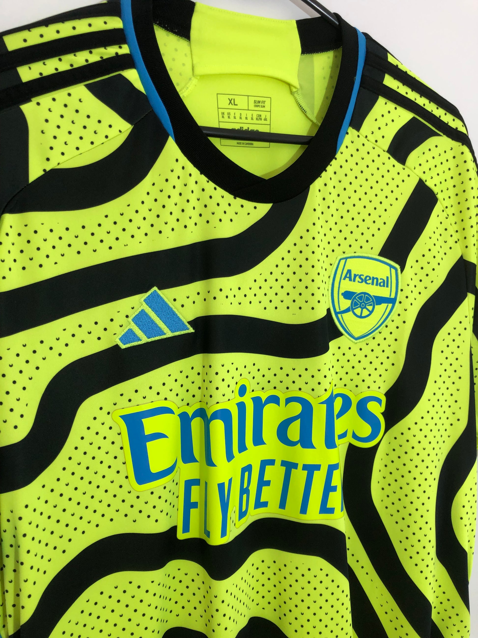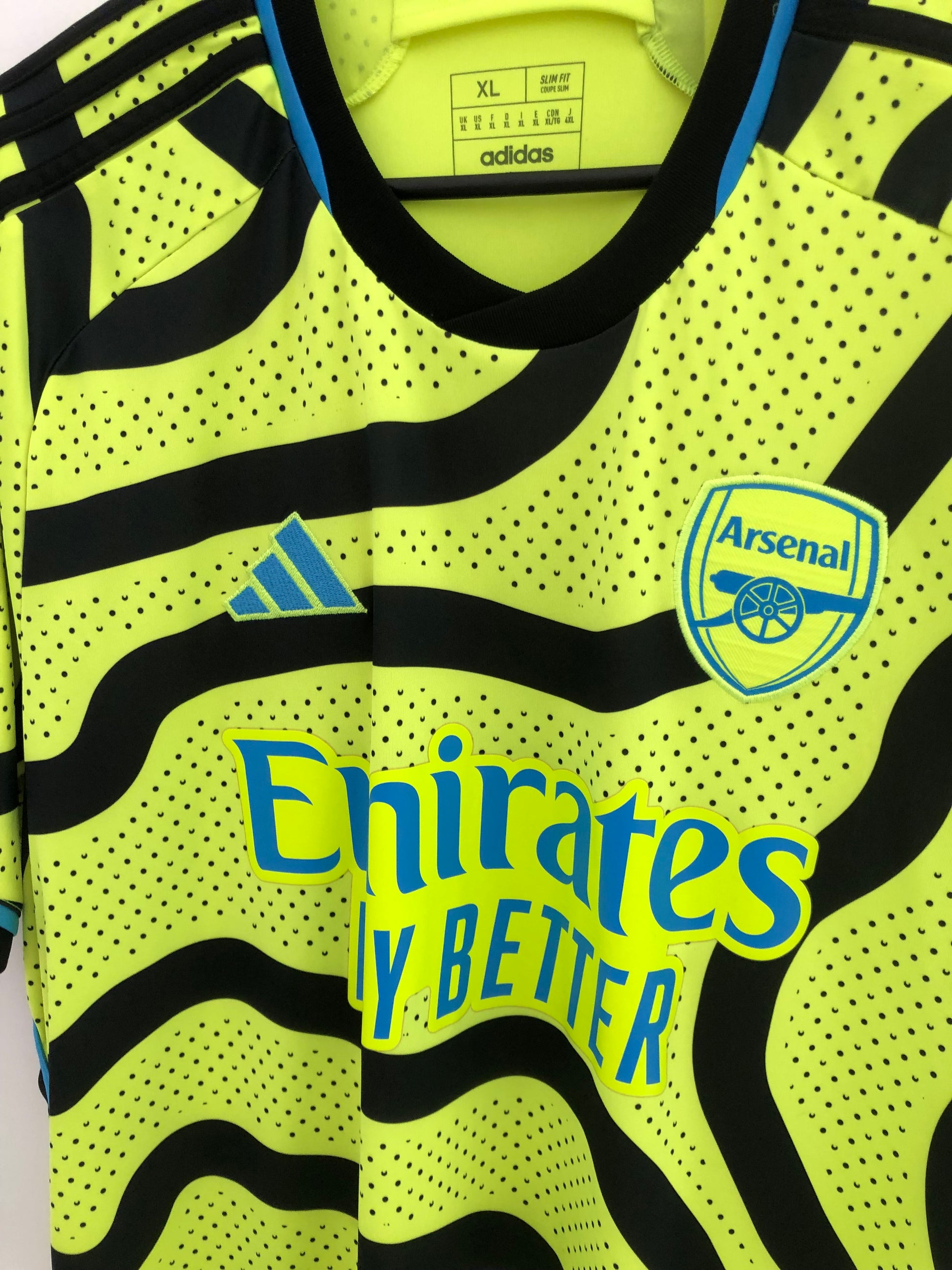 Show your support for Arsenal with this excellent condition 2023/24 away football shirt. The fluro yellow shirt features short sleeves and a loose fit, making it suitable for adults in a size XL. The shirt is made by Adidas and has a product code of HR6927, ensuring that you get a genuine item. This shirt has collar to hem measurements of 30 inches and pit to pit measurements of 23 inches. This shirt is suitable for wearing casually or at the match, so why not show your love for Arsenal by getting this shirt today.