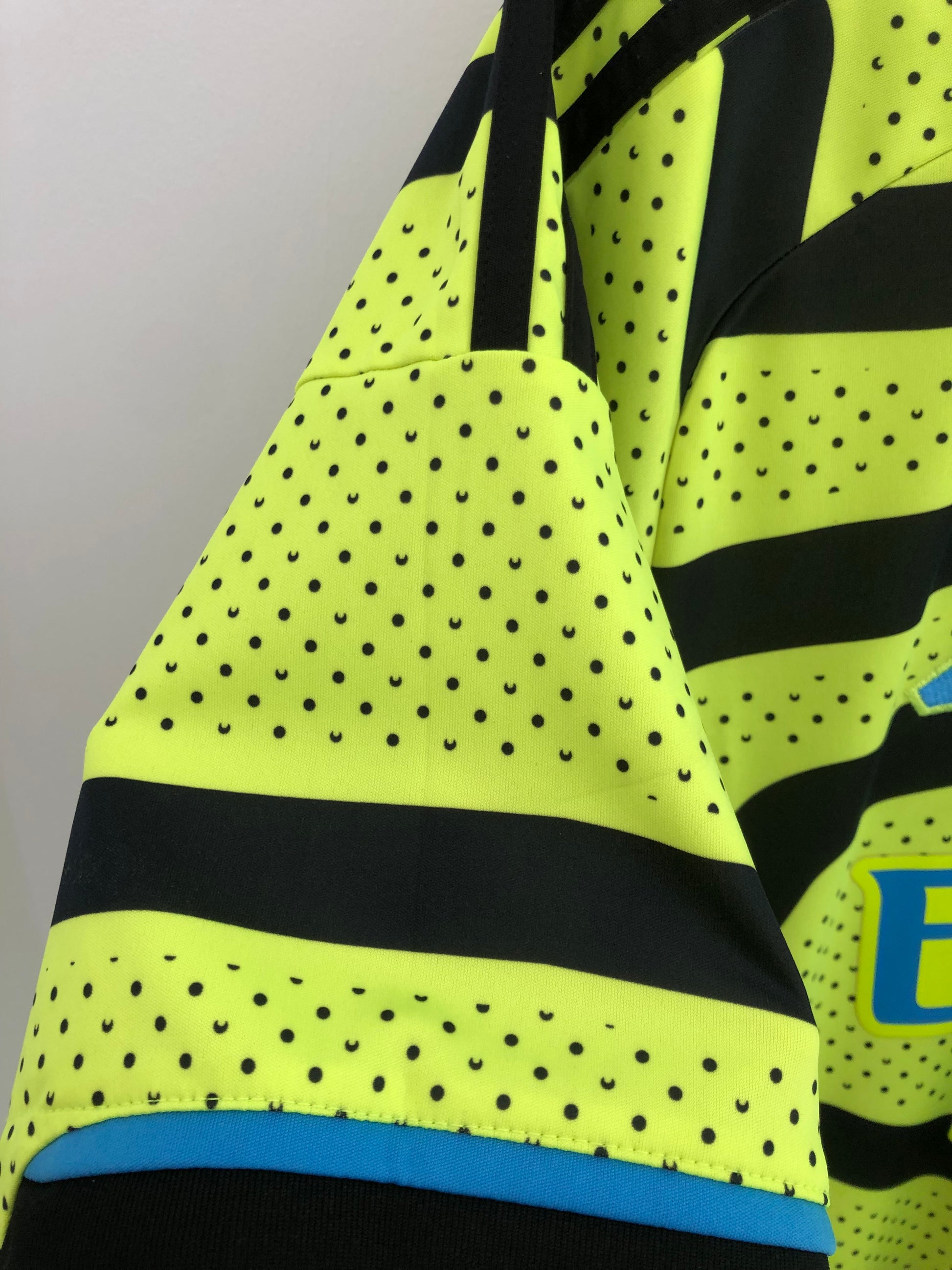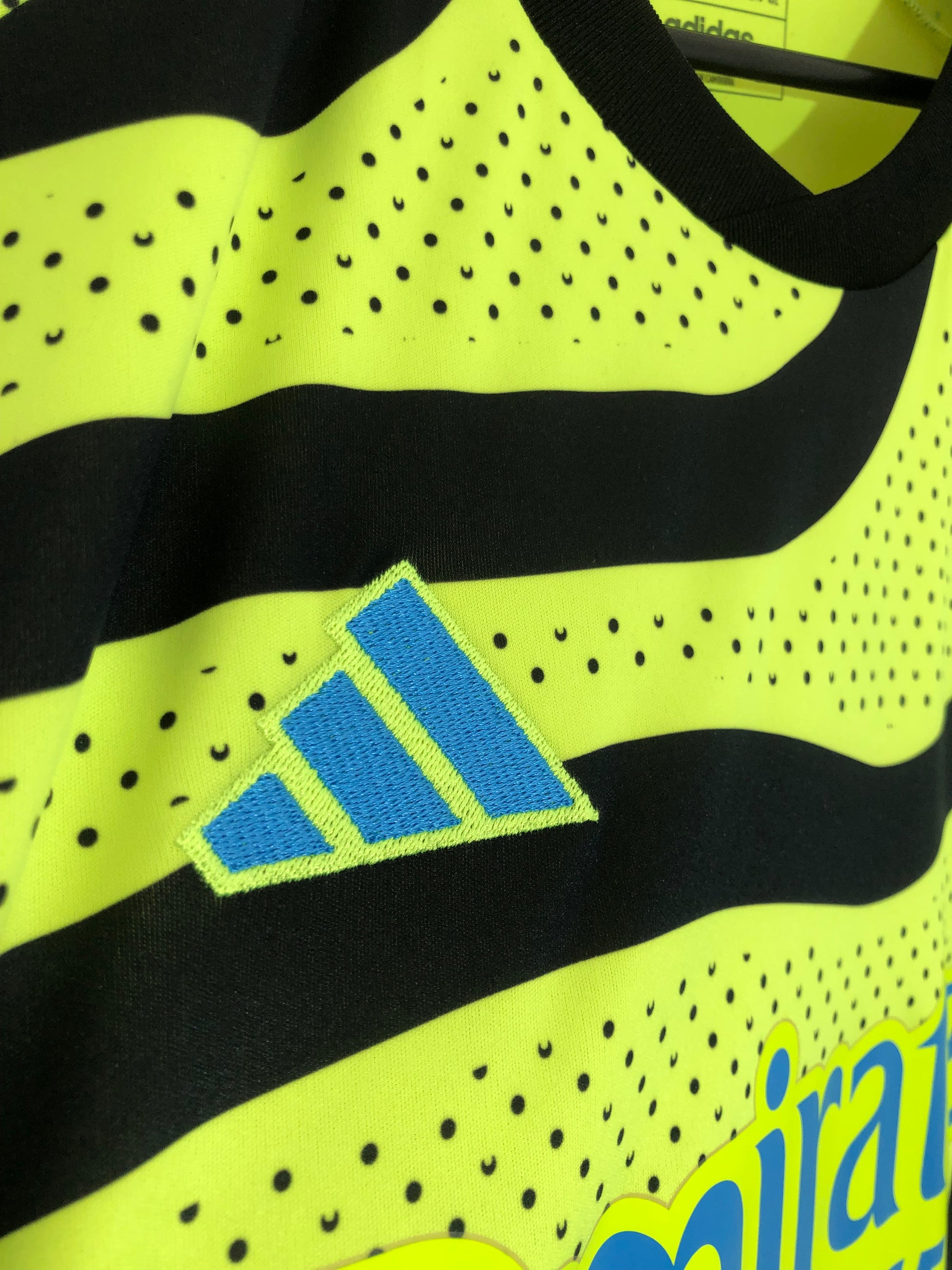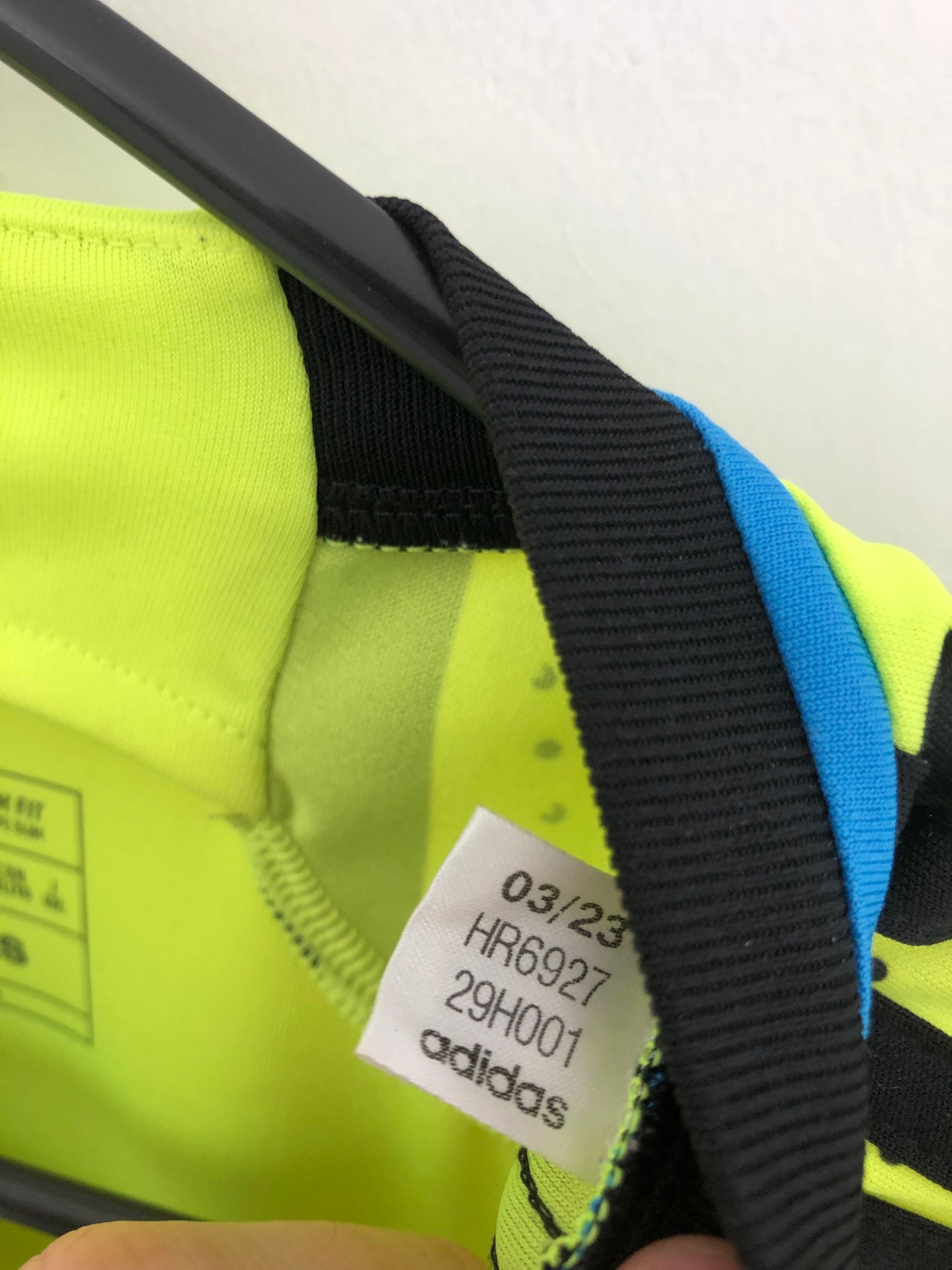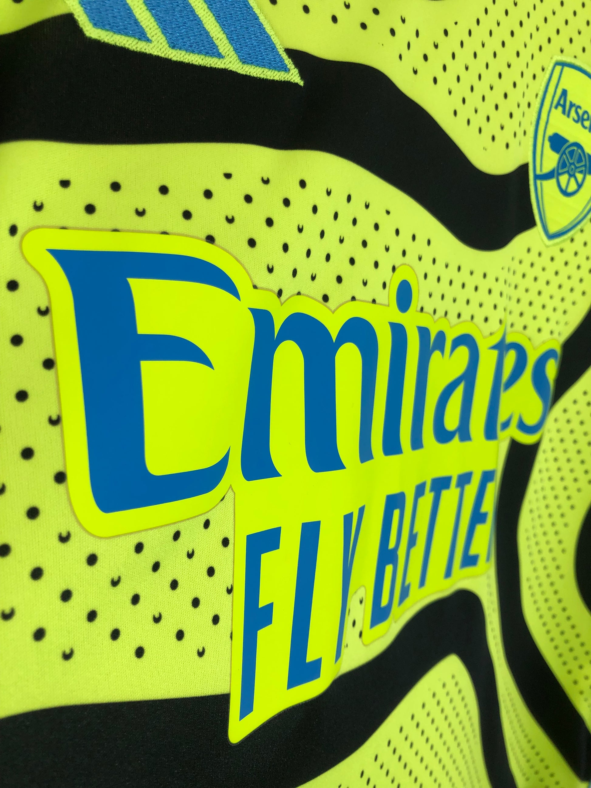 Show your support for Arsenal with this excellent condition 2023/24 away football shirt. The fluro yellow shirt features short sleeves and a loose fit, making it suitable for adults in a size XL. The shirt is made by Adidas and has a product code of HR6927, ensuring that you get a genuine item. This shirt has collar to hem measurements of 30 inches and pit to pit measurements of 23 inches. This shirt is suitable for wearing casually or at the match, so why not show your love for Arsenal by getting this shirt today.