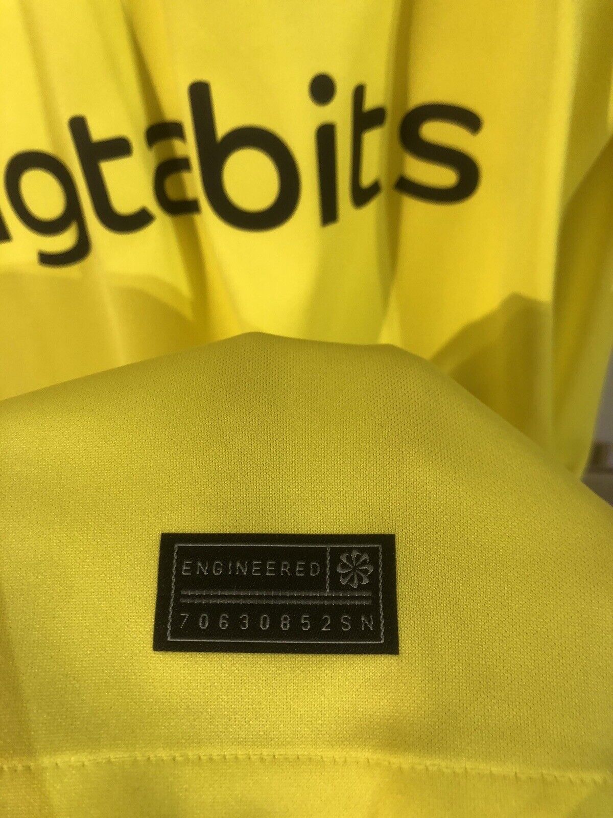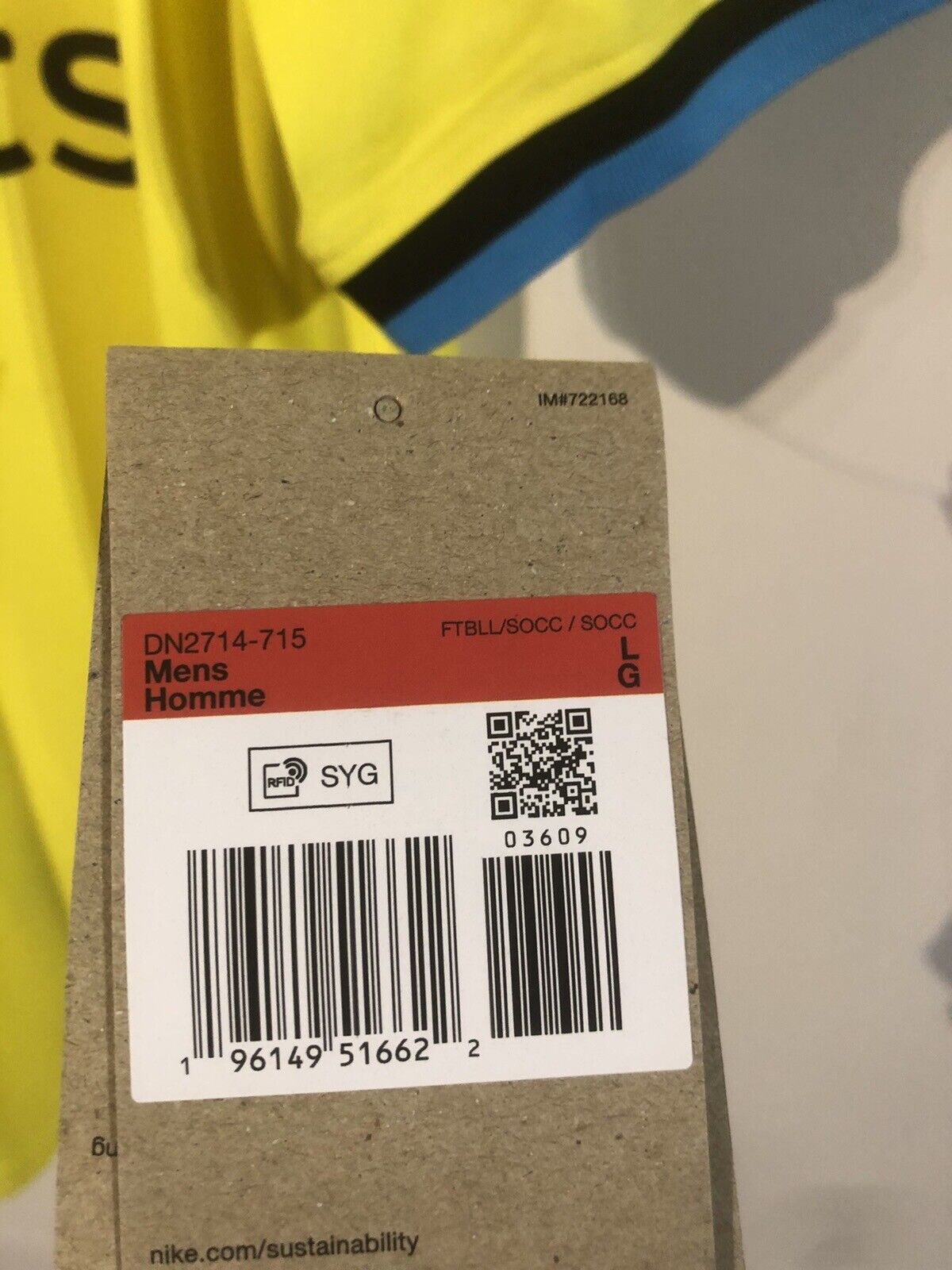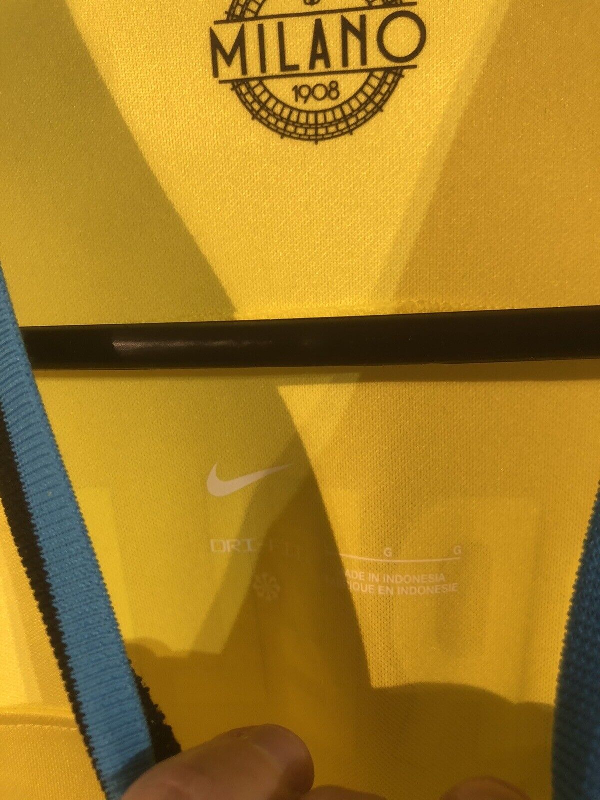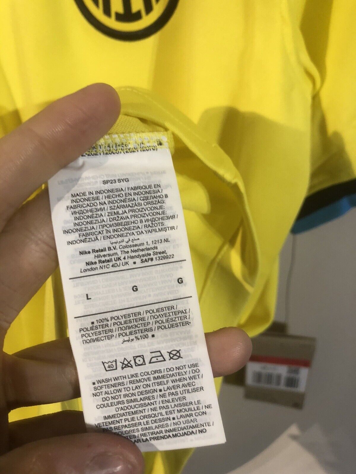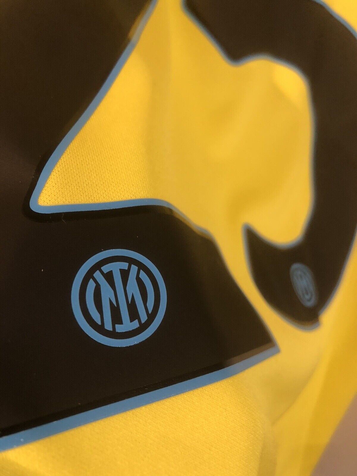 Show your support for Inter Milan with this brand new and unworn football shirt jersey from Nike. Featuring Nicola Barella's name and number #23 on the back, this third kit is perfect for any fan or collector. The short-sleeved shirt is designed for adults and comes in size L, with the classic yellow colour worn by the Italian club.