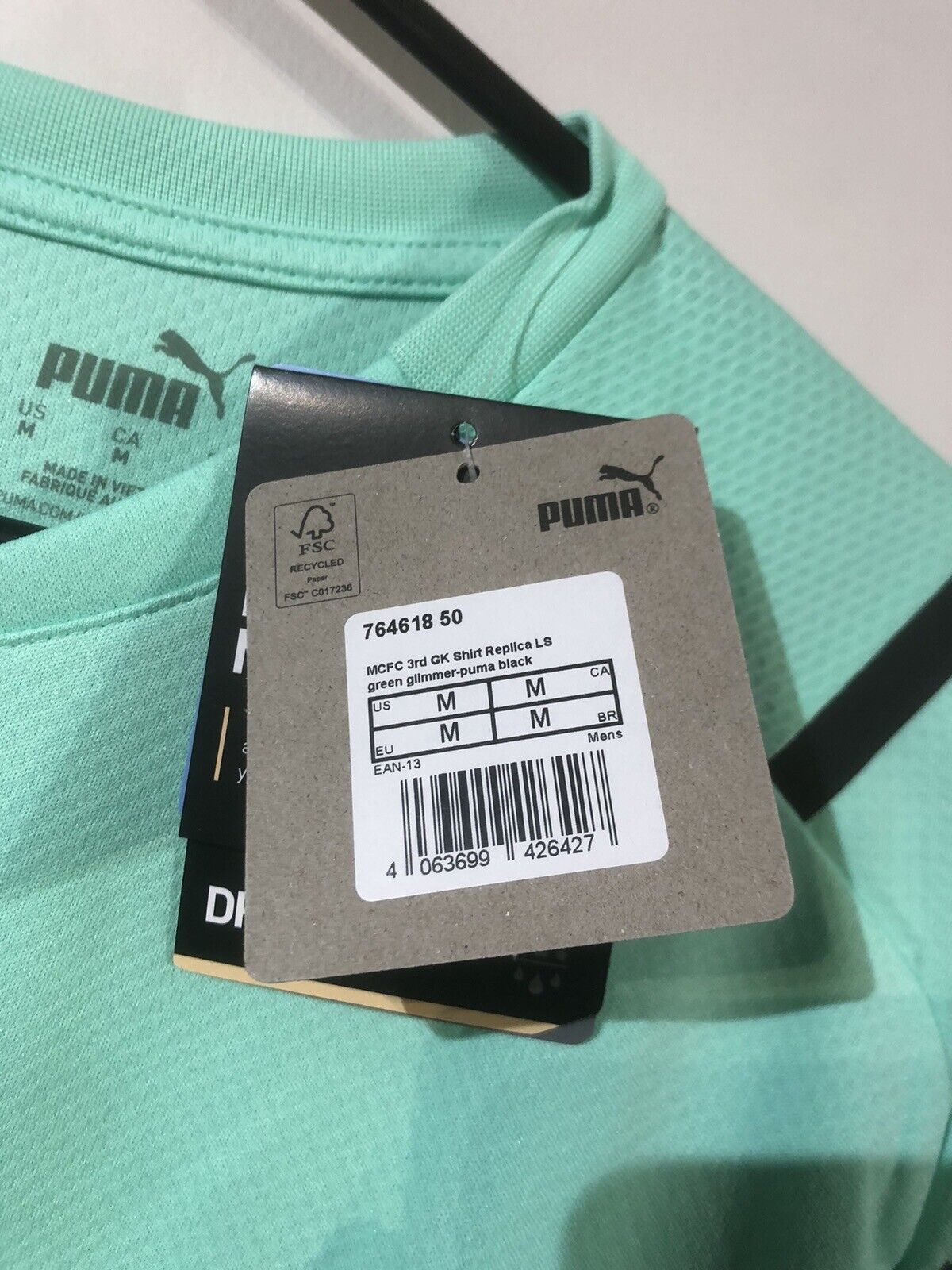 Show your support for Manchester City with this brand new, never worn goalkeeper shirt featuring the number 31 and the name Ederson M. on the back. Made by PUMA, this short-sleeved shirt is suitable for adults and comes in a size medium. The shirt is in the main colour green and is an official 2021/22 release for Manchester City.