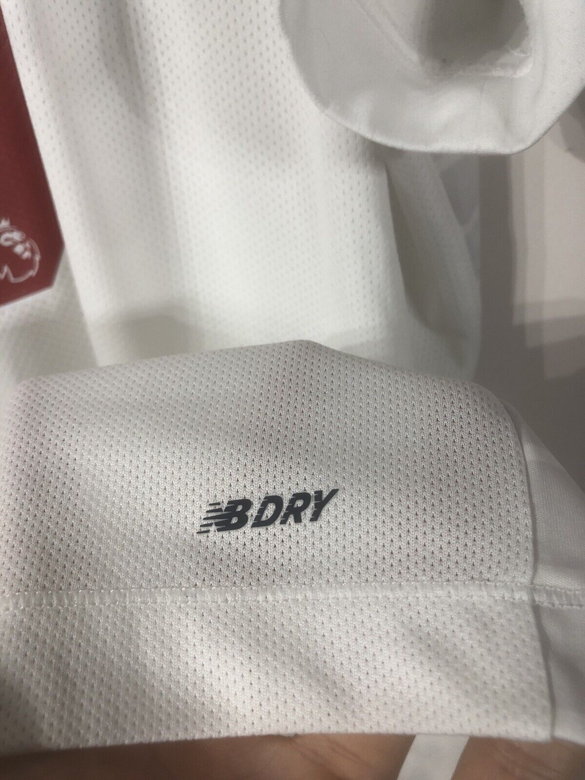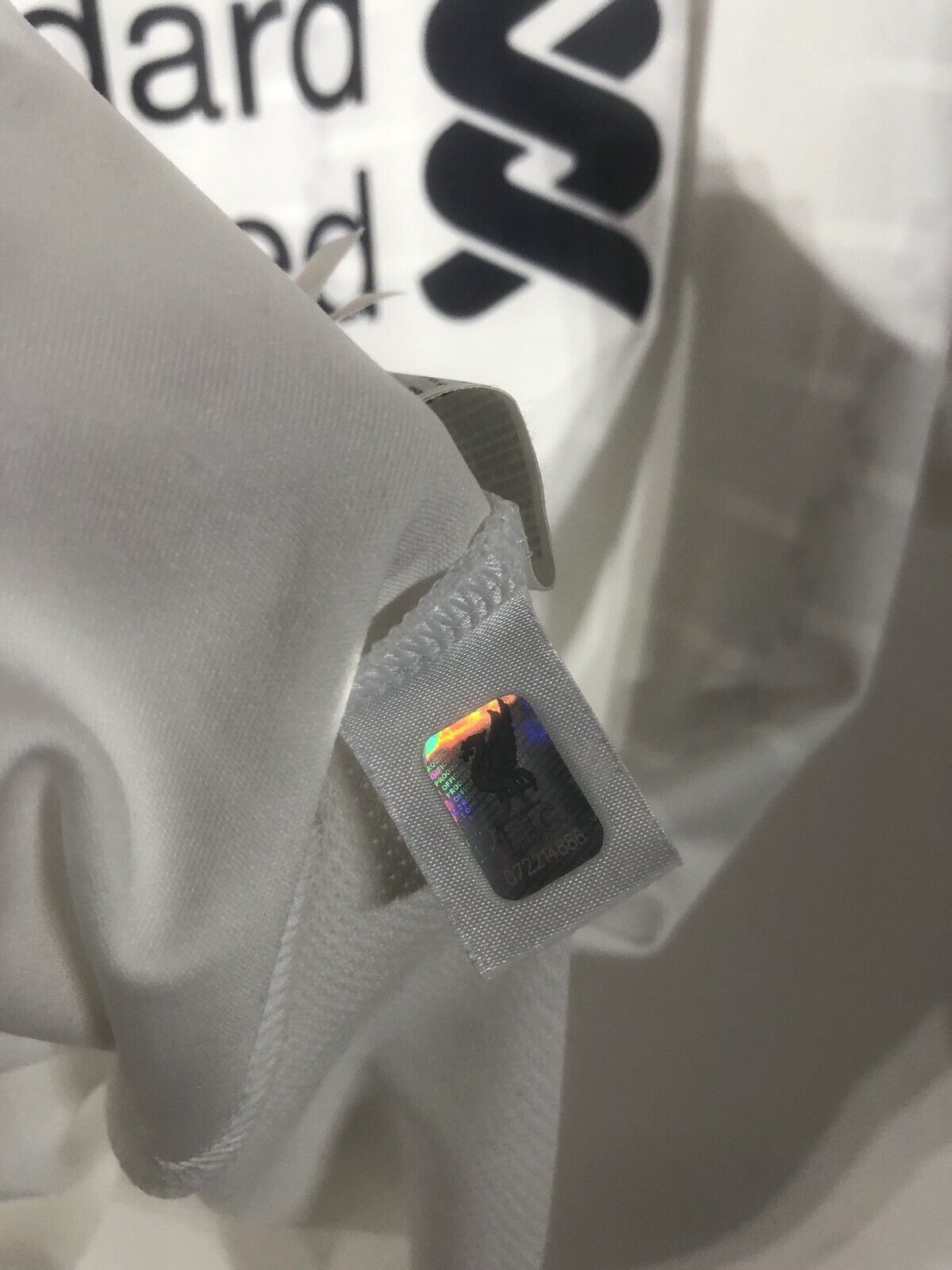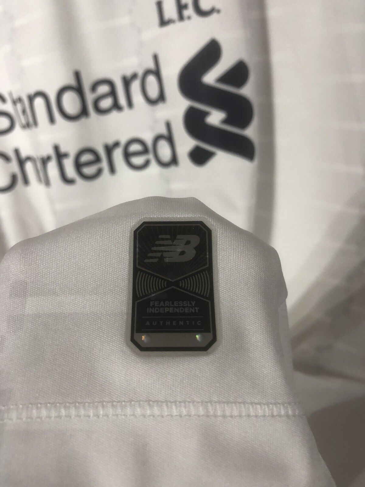 Show your support for Liverpool with this excellent condition Firmino #9 2019/20 away football shirt. The stylish white shirt features short sleeves and a loose fit, making it suitable for adults in a size XXL. The shirt is made by New Balance and has a product code of MT930013, ensuring that you get a genuine item. This shirt has collar to hem measurements of 31 inches and pit to pit measurements of 25 inches. The shirt has a official Liverpool Firmino #9 nameset and an official Premier League patch. This shirt is suitable for wearing casually or at the match, so why not show your love for Liverpool by getting this shirt today.