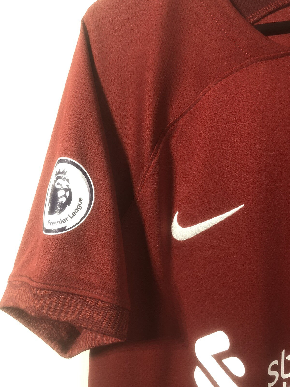 Show your support for Liverpool with this excellent condition Firmino #9 2022/23 home football shirt. The red shirt features short sleeves and a loose fit, making it suitable for adults in a size medium. The shirt is made by Nike and has a product code of DM1843-609, ensuring that you get a genuine item. This shirt has collar to hem measurements of 28 inches and pit to pit measurements of 21 inches. The shirt has an official Avery Dennison Firmino #9 nameset and a official Premier League patch. This shirt is suitable for wearing casually or at the match, so why not show your love for Liverpool by getting this shirt today.