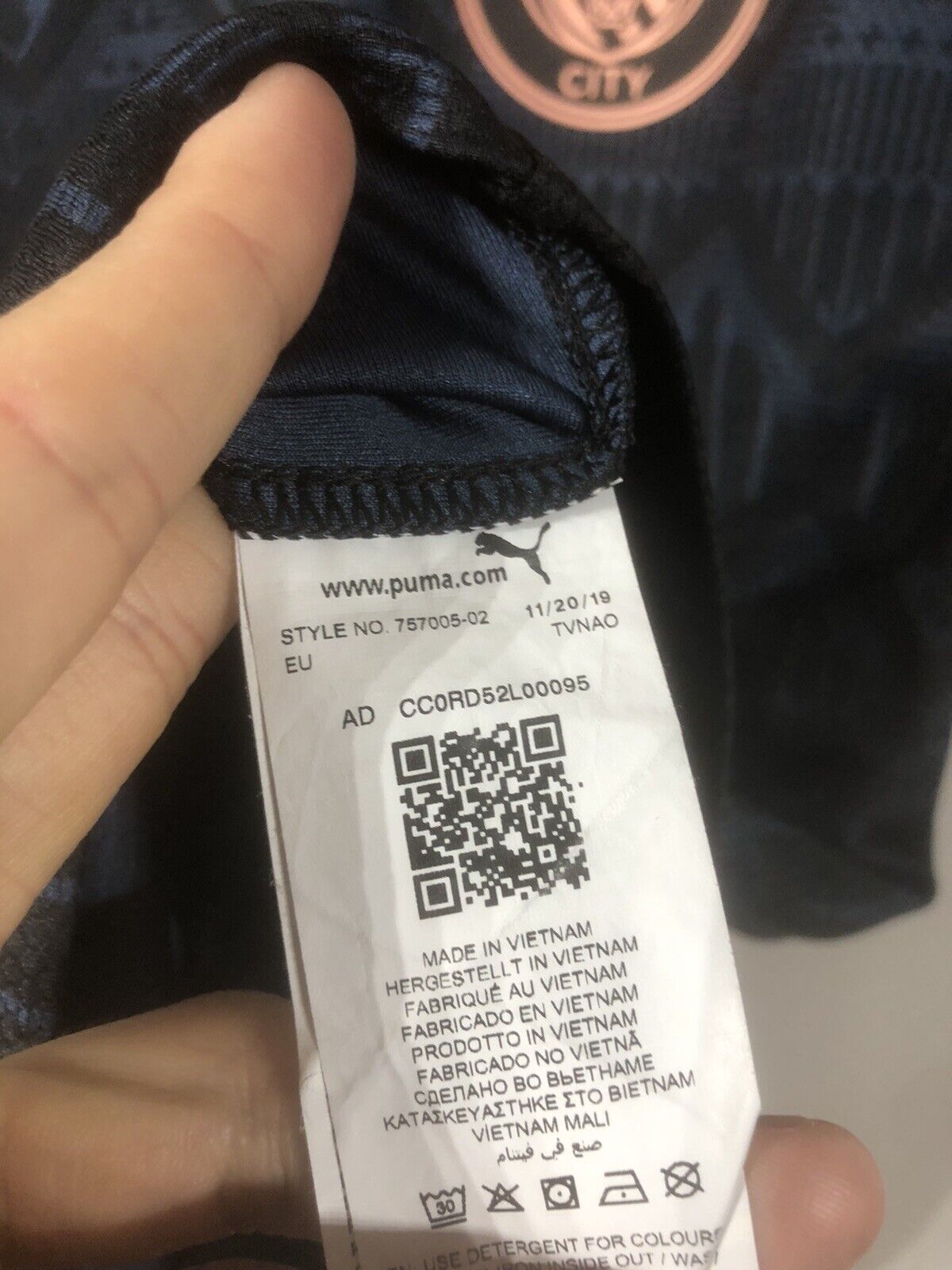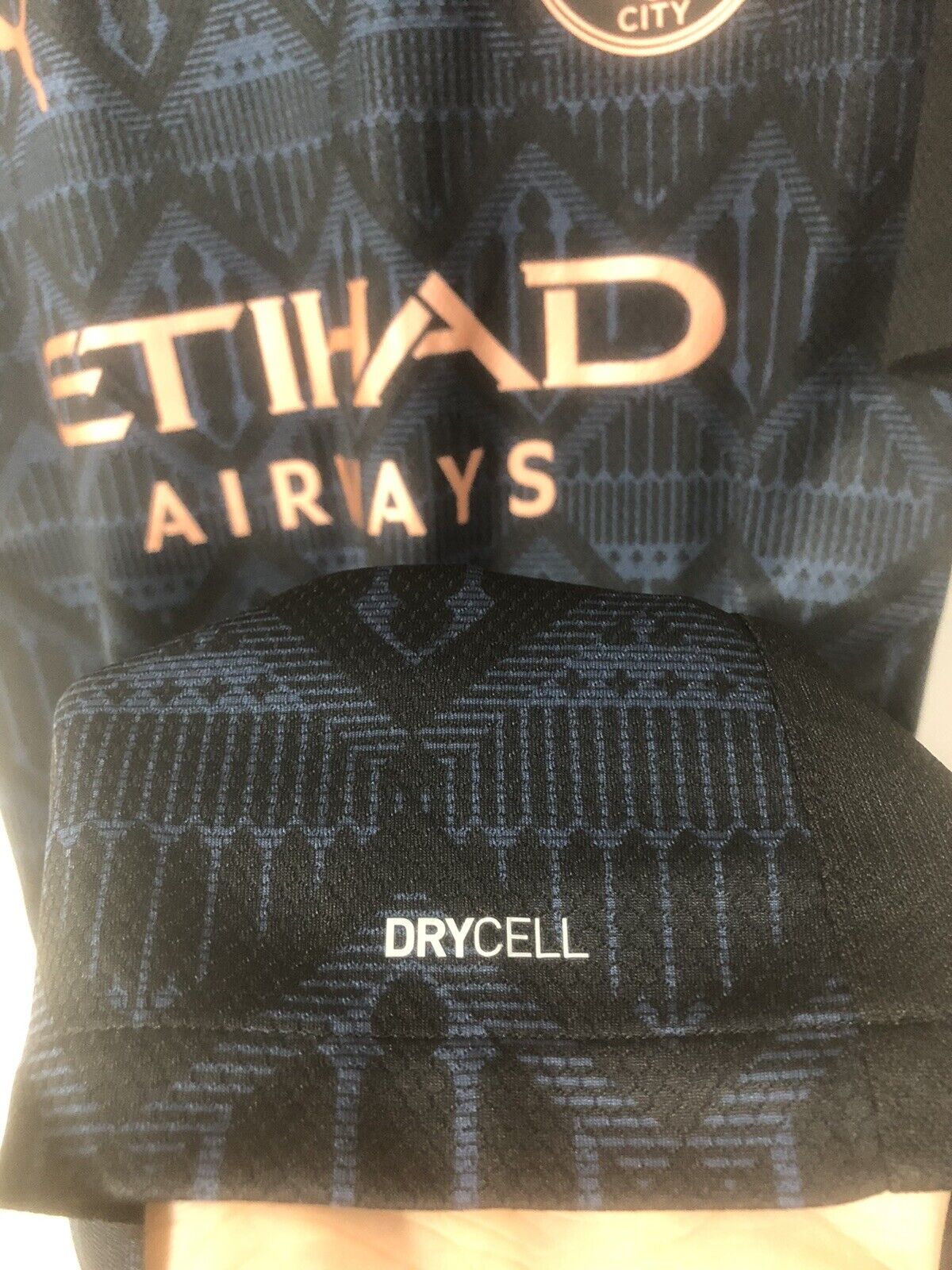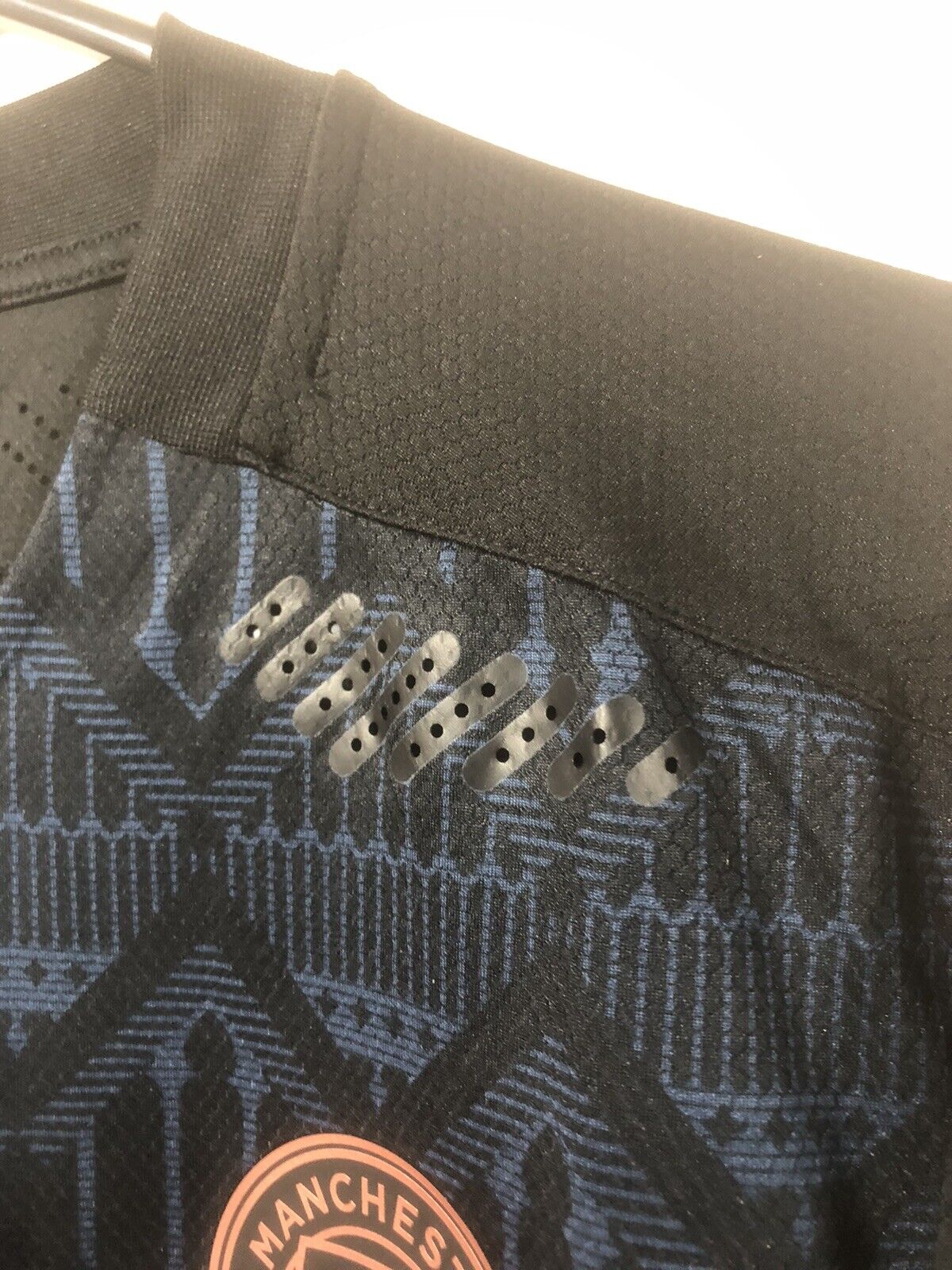 Show your support for Manchester City with this excellent condition Foden #47 2020/21 authentic away football shirt. The stylish black shirt features short sleeves and a tight fit, making it suitable for adults in a size large. The shirt is made by Puma, ensuring that you get a genuine item. This shirt has collar to hem measurements of 29 inches and pit to pit measurements of 21 inches. The shirt has a official Avery Dennison Foden #47 nameset and an official player size Premier League patch. This shirt is suitable for wearing casually or at the match, so why not show your love for Manchester City by getting this shirt today.