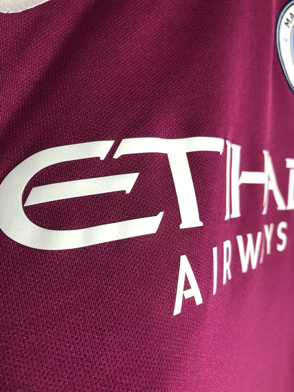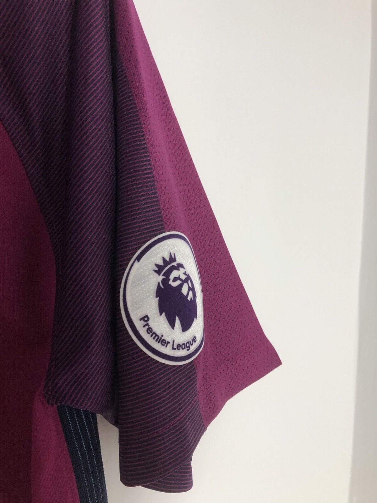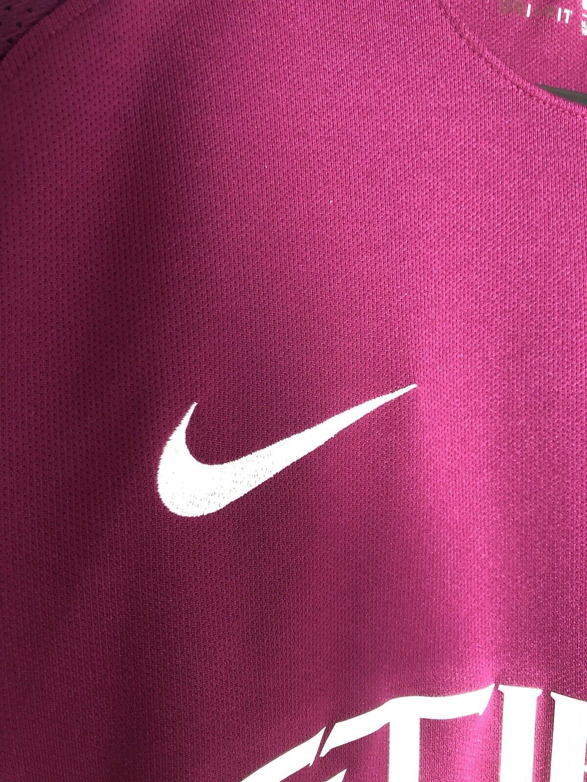 Show your support for Manchester City with this excellent condition Nike Foden #47 2017/18 medium away football shirt. The stylish deep purple shirt features short sleeves and a loose fit, making it suitable for adults in a size medium. The shirt is made by Nike and has a product code of 847260-667, ensuring that you get a genuine item. This shirt has collar to hem measurements of 28 inches and pit to pit measurements of 21 inches. The shirt has an official Foden #47 nameset. This shirt is suitable for wearing casually or at the match, so why not show your love for Manchester City by getting this shirt today.