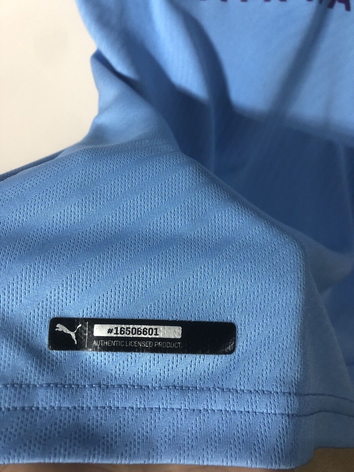 Show your support for Manchester City with this excellent condition PUMA Foden #47 2019/20 small home football shirt. The striking blue design features short sleeves and a loose fit, making it suitable for adults in a size small. The shirt is made by PUMA and has a product code of 755586-01, ensuring that you get a genuine item. This shirt has collar to hem measurements of 26 inches and pit to pit measurements of 18 inches. The shirt has an official premier league champions 2018/19 patch and an official premier league Foden #47 nameset. This shirt is suitable for wearing casually or at the match, so why not show your love for Manchester City by getting this shirt today.