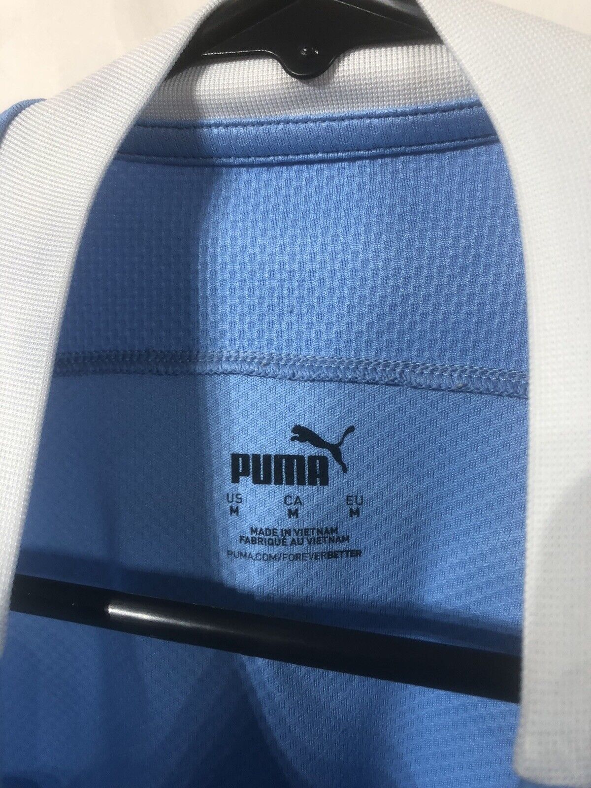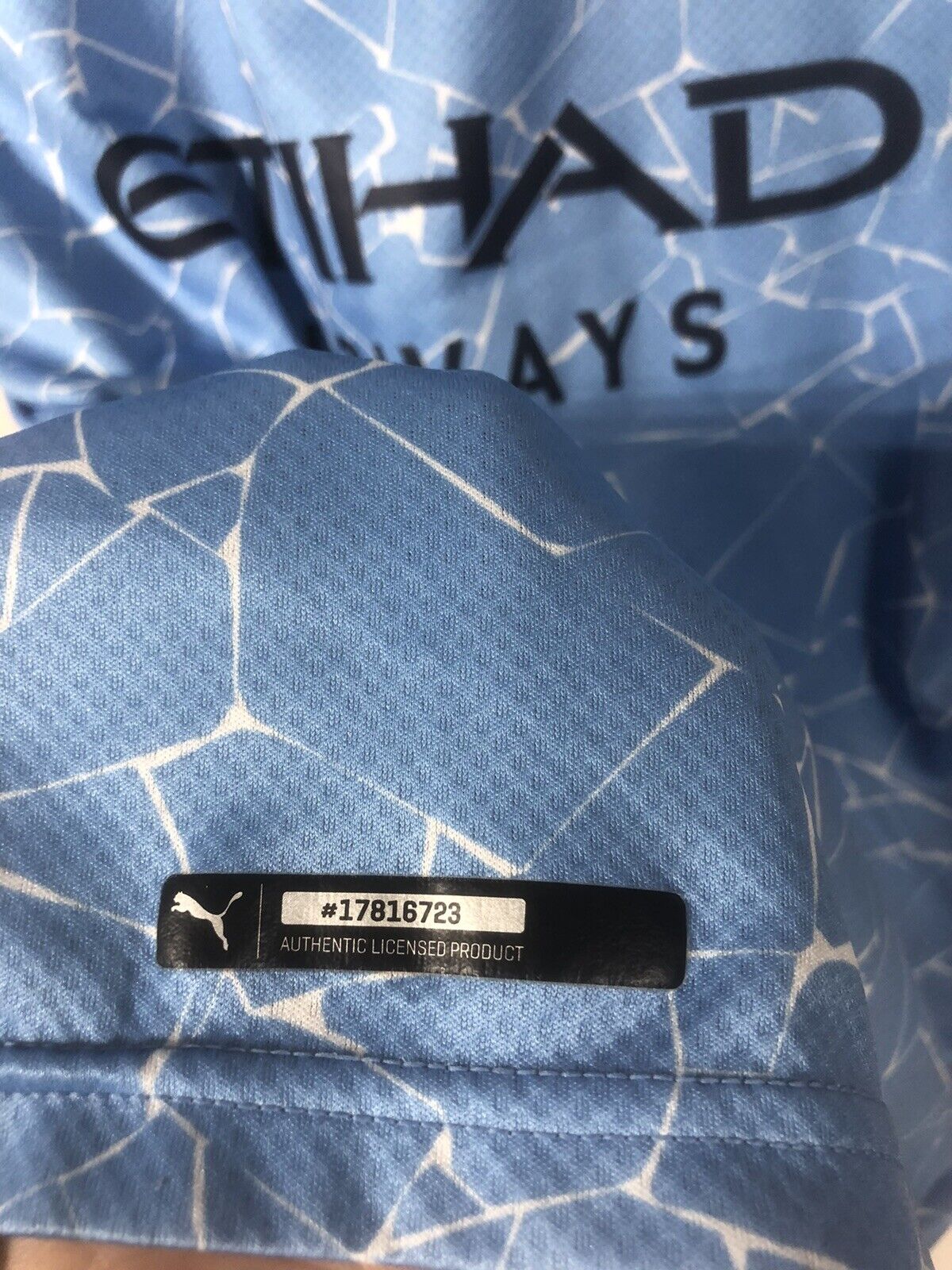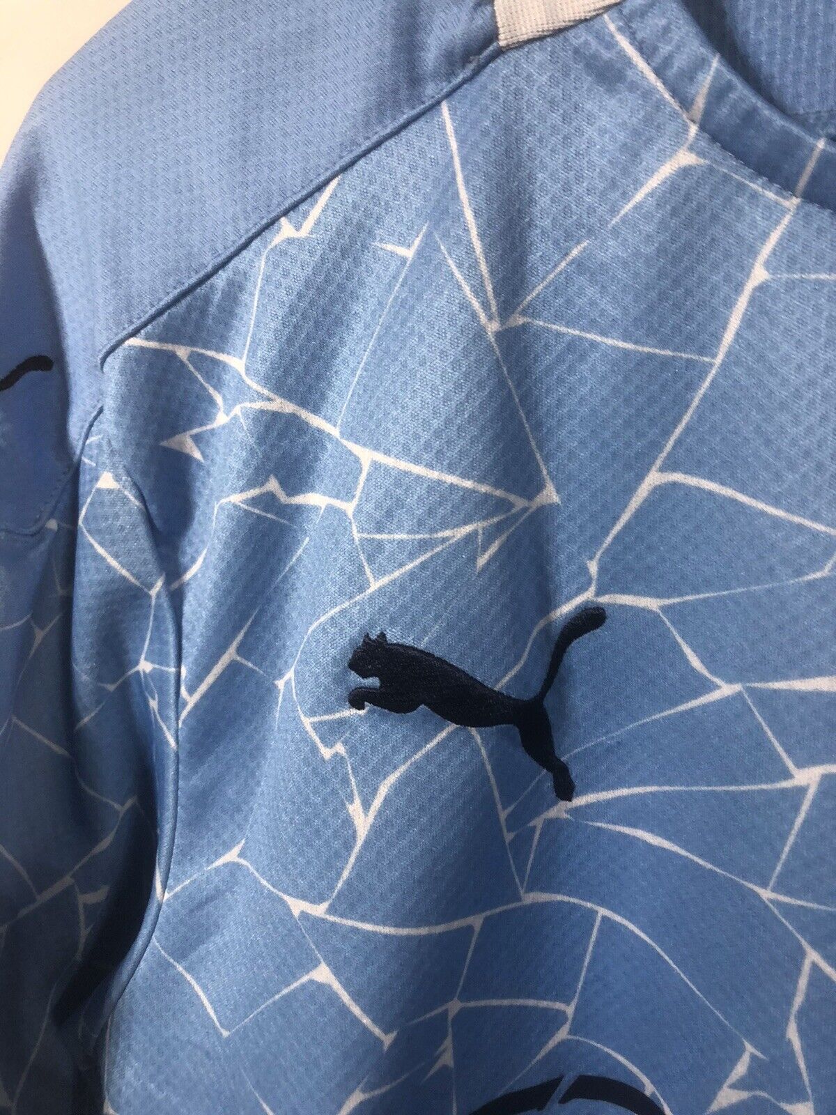 Show your support for Manchester City with this excellent condition PUMA Foden #47 2020/21 medium home football shirt. The sky blue mosiac shirt features short sleeves and a loose fit, making it suitable for adults in a size medium. The shirt is made by PUMA and has a product code of 757058-01, ensuring you get a genuine item. This shirt has collar to hem measurements of 27 inches and pit to pit measurements of 20 inches. The shirt has an official Foden #47 nameset and a Premier League patch. This shirt is suitable for wearing casually or at the match, so why not show your love for Manchester City by getting this shirt today.
