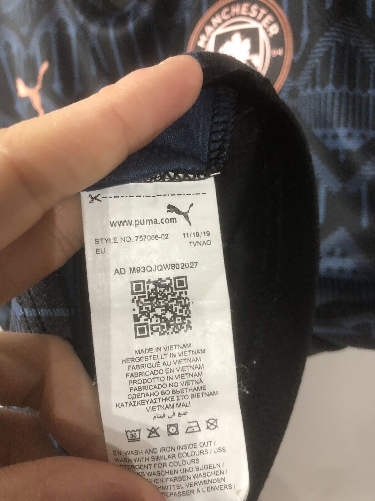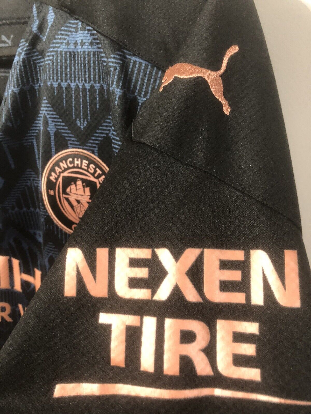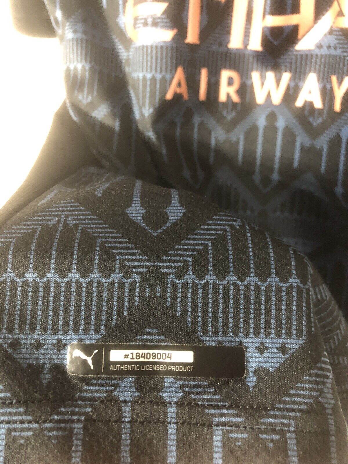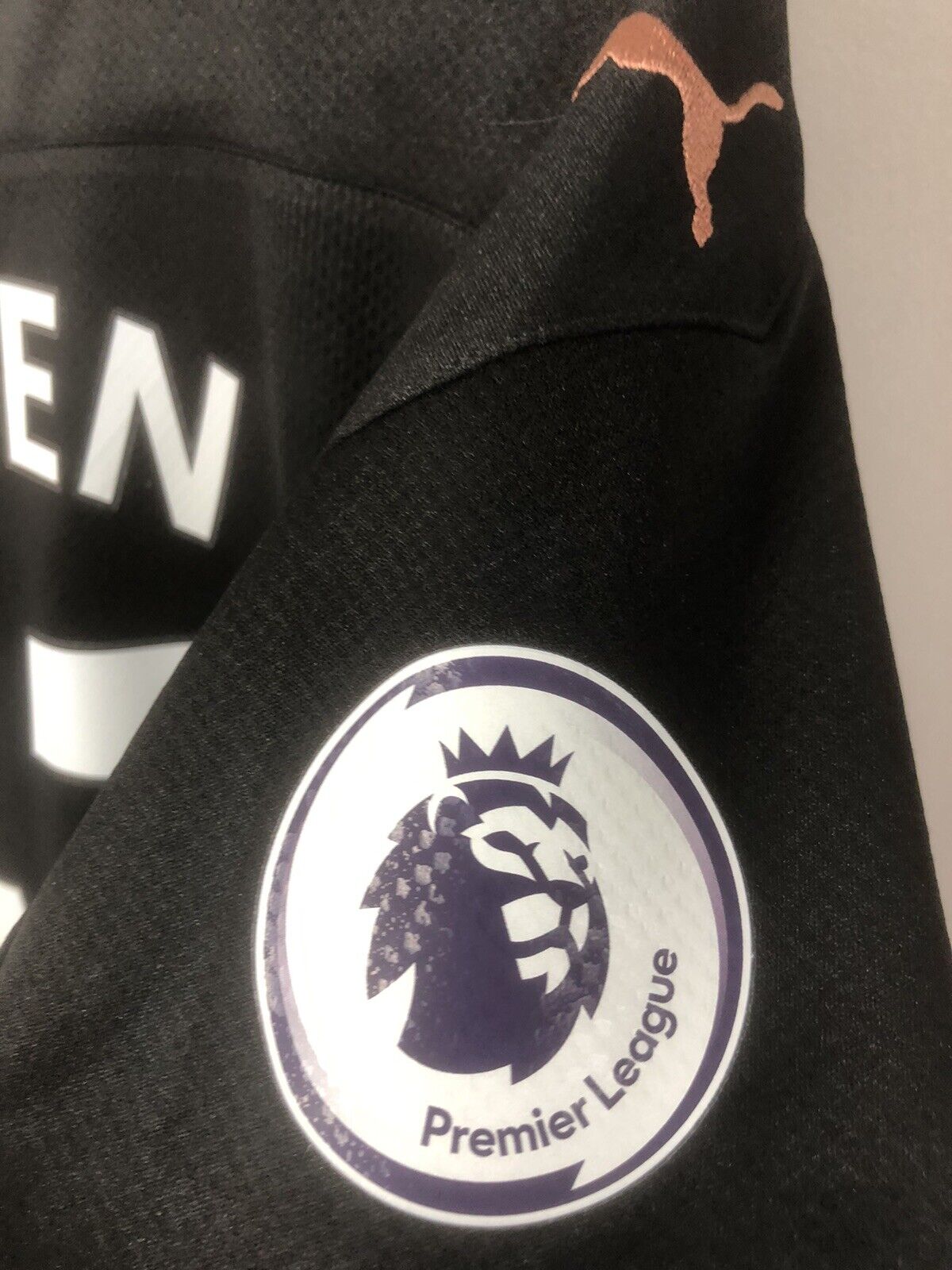Show your support for Manchester City with this excellent condition PUMA Foden #47 2020/21 medium away football shirt. The striking black design features short sleeves and a tight fit, making it suitable for adults in a small or medium. The shirt is made by PUMA and has a product code of 757065-02, ensuring that you get a genuine item. This shirt has collar to hem measurements of 27 inches and pit to pit measurements of 20 inches. The shirt has an official player size premier league patch and an official premier league Foden #47 nameset. This shirt is suitable for wearing casually or at the match, so why not show your love for Manchester City by getting this shirt today.