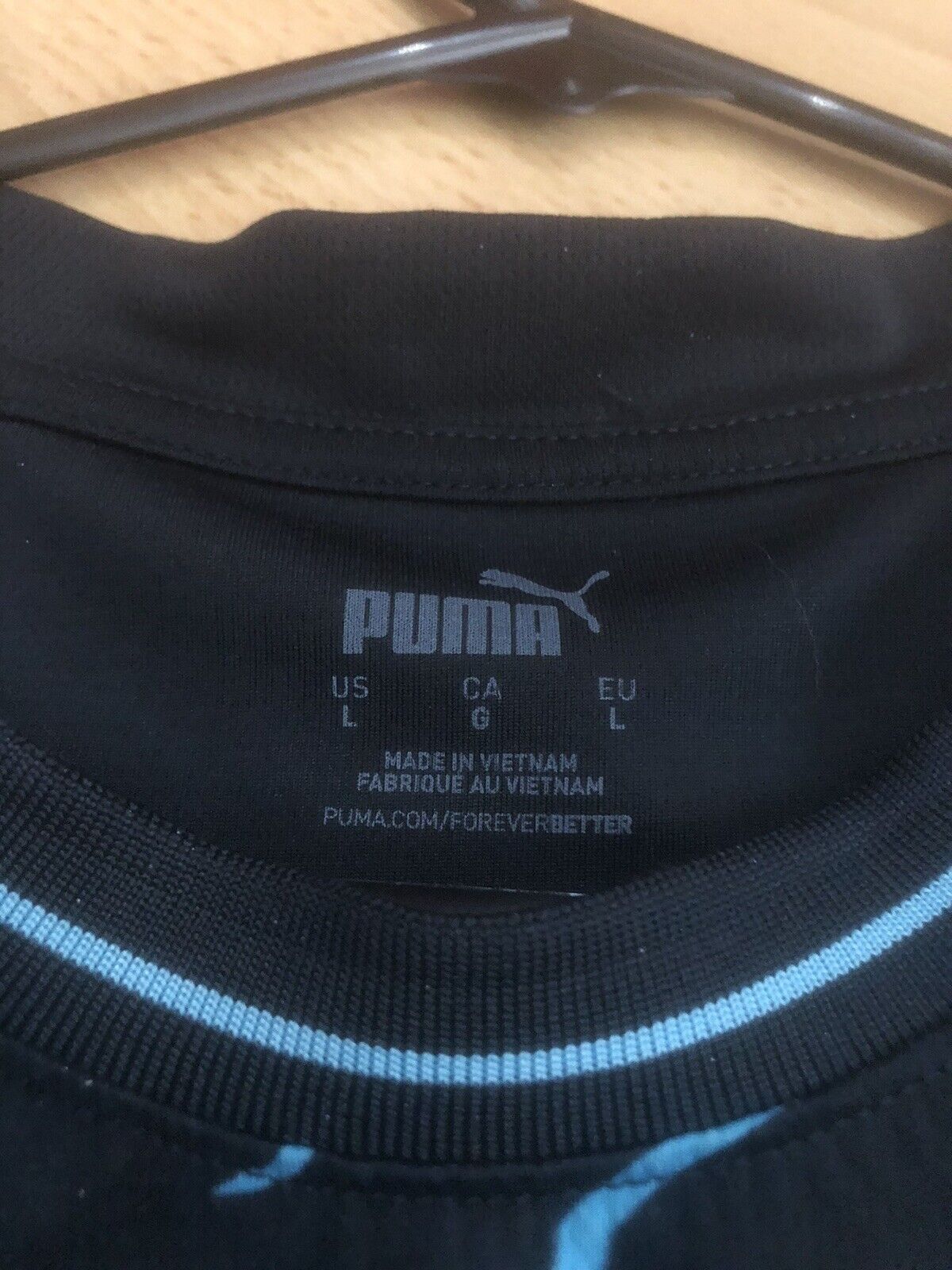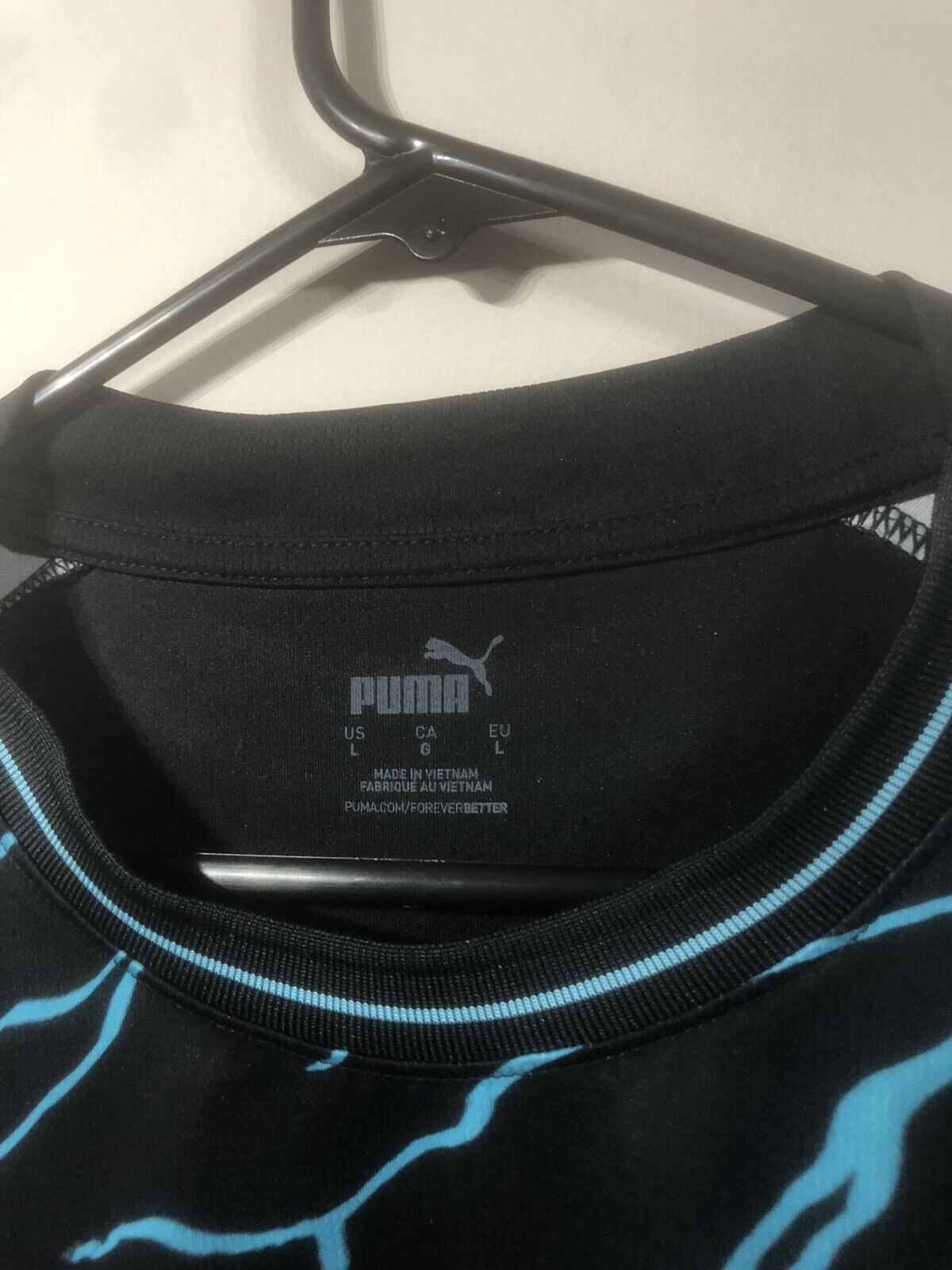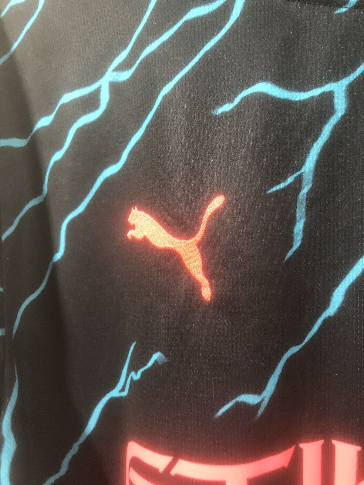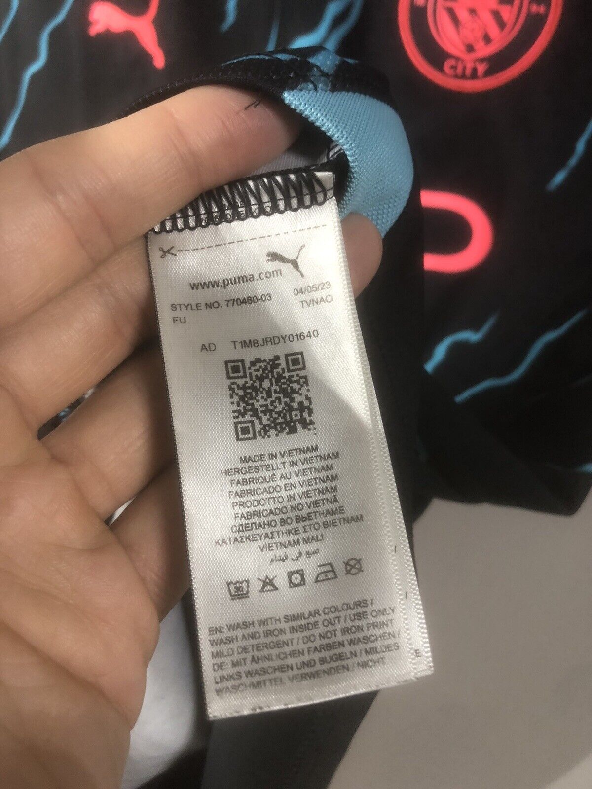 Show your support for Manchester City with this excellent condition Haaland #9 2023/24 3rd football shirt. The shirt features short sleeves and a loose fit, making it suitable for adults in a size large. The shirt is made by PUMA and has a product code of 770460-03, ensuring that you get a genuine item. This shirt has collar to hem measurements of 28 inches and pit to pit measurements of 21 inches. The shirt has an official Haaland #9 nameset. This shirt is suitable for wearing casually or at the match, so why not show your love for Manchester City by getting this shirt today.