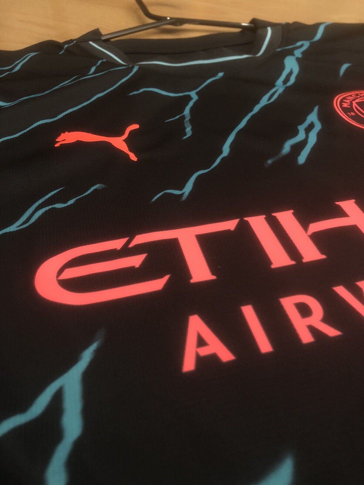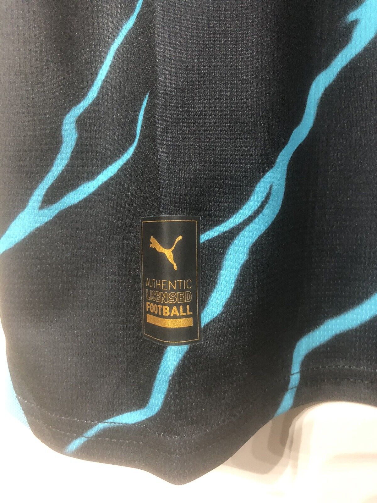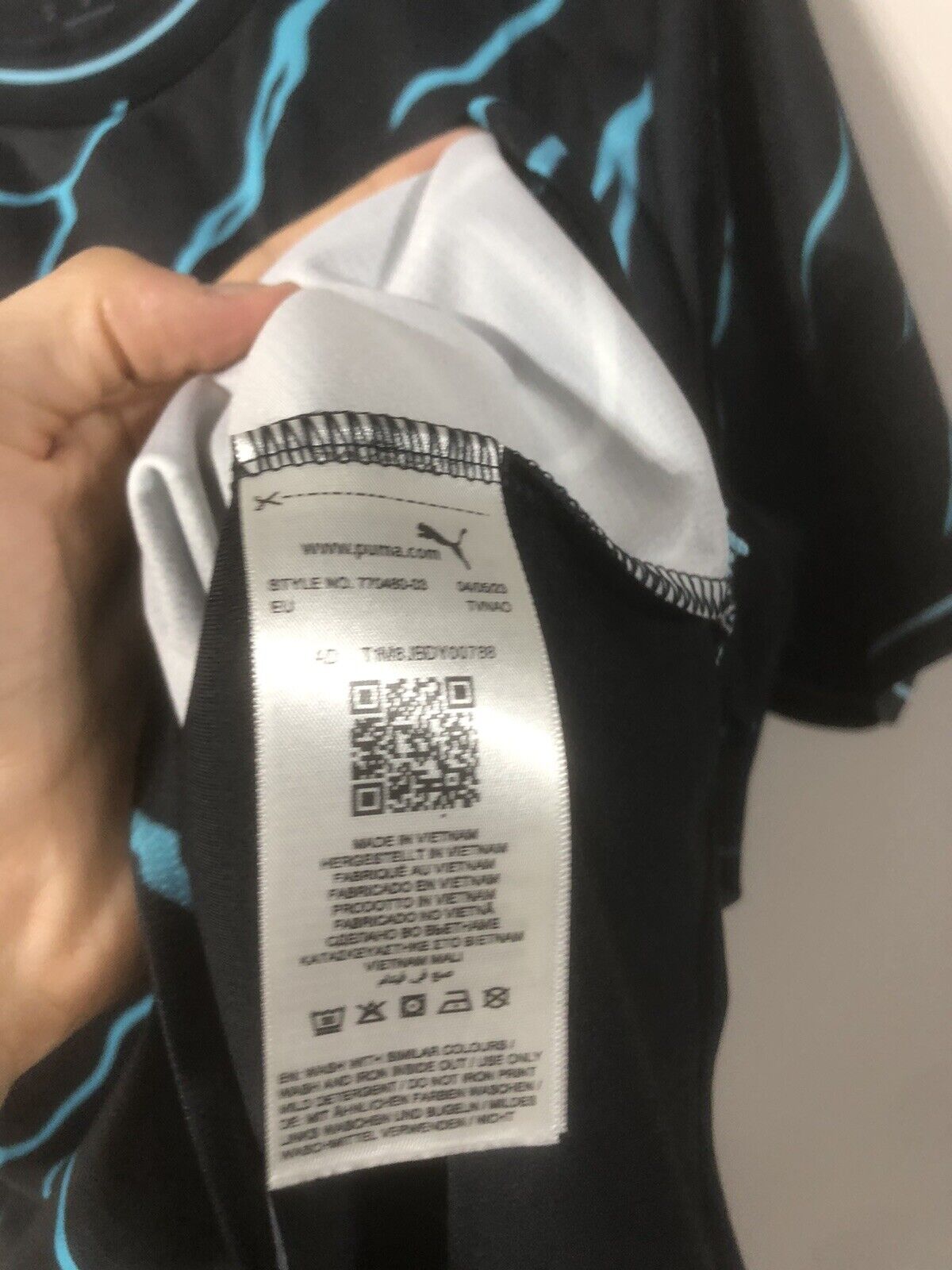 Show your support for Manchester City with this excellent condition Haaland #9 2023/24 3rd football shirt. The shirt features short sleeves and a loose fit, making it suitable for adults in a size medium. The shirt is made by PUMA and has a product code of 770461-03, ensuring that you get a genuine item. This shirt has collar to hem measurements of 28 inches and pit to pit measurements of 21 inches. The shirt has an official Haaland #9 nameset. This shirt is suitable for wearing casually or at the match, so why not show your love for Manchester City by getting this shirt today.