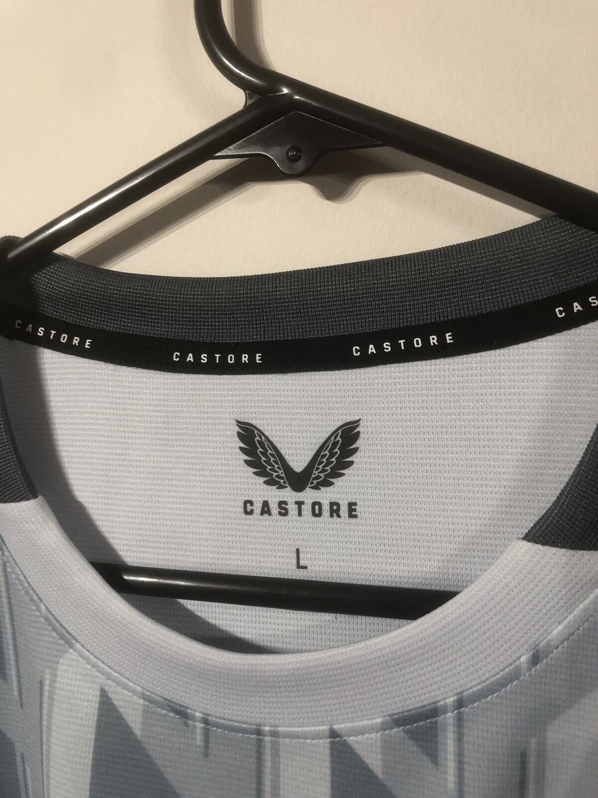 This is a brand new, with tags, Wolverhampton Wanderers football shirt made by Castore. The shirt features the name and number of Hwang Hee Chan (#11) on the back. It is a size large with long sleeves and is suitable for adults. The shirt is the 2022/23 away kit and comes in a grey colour.
