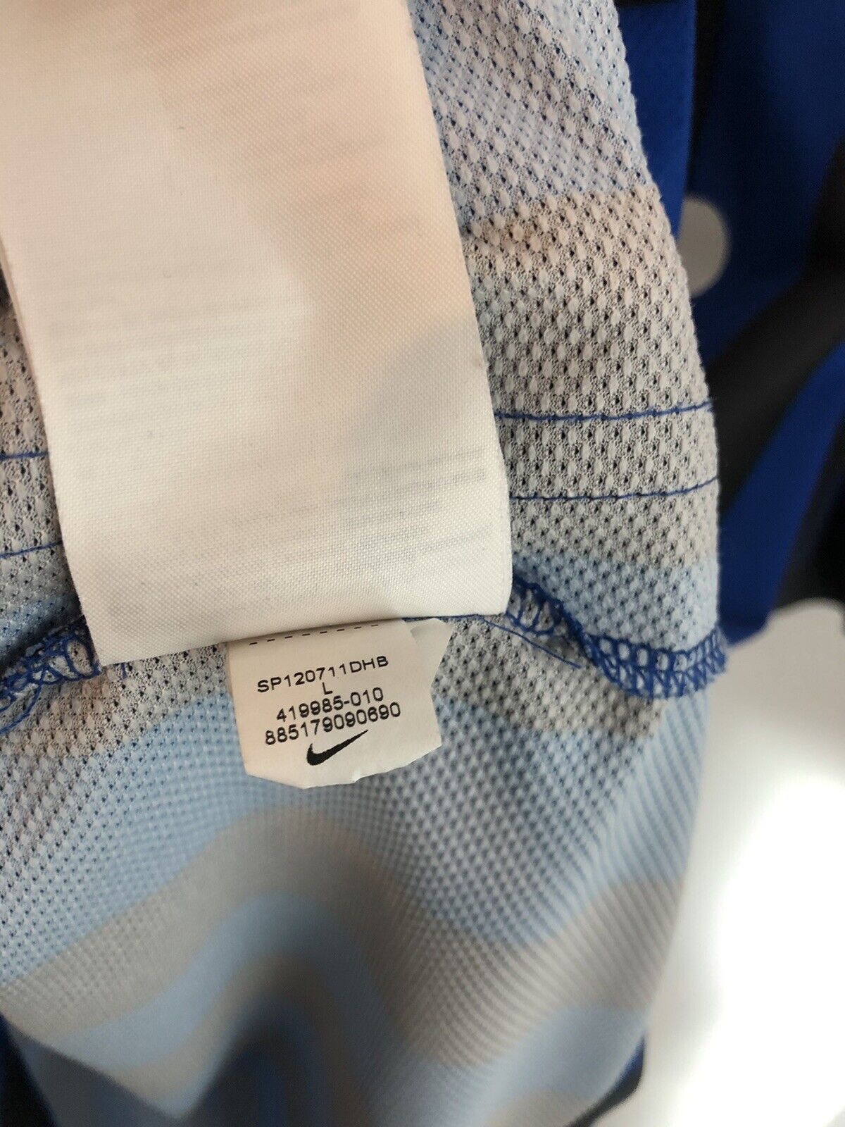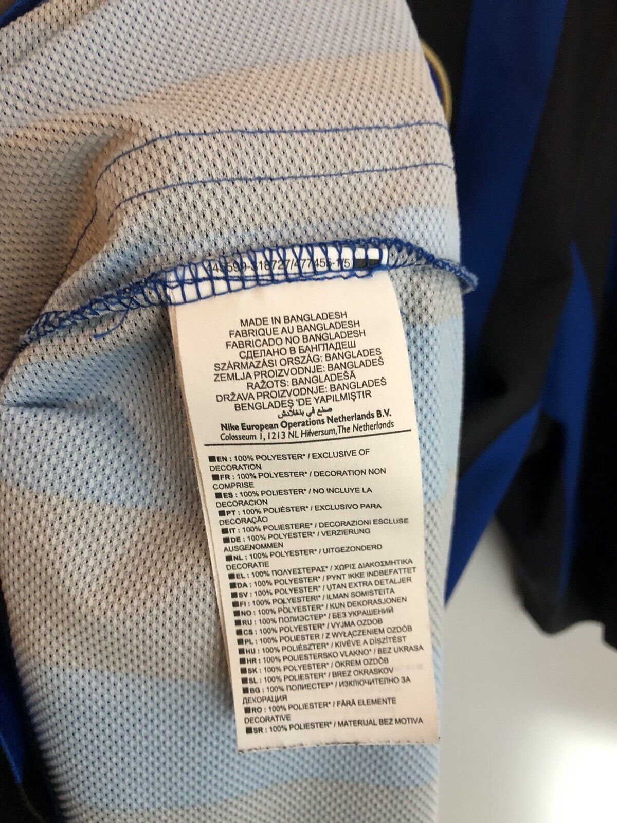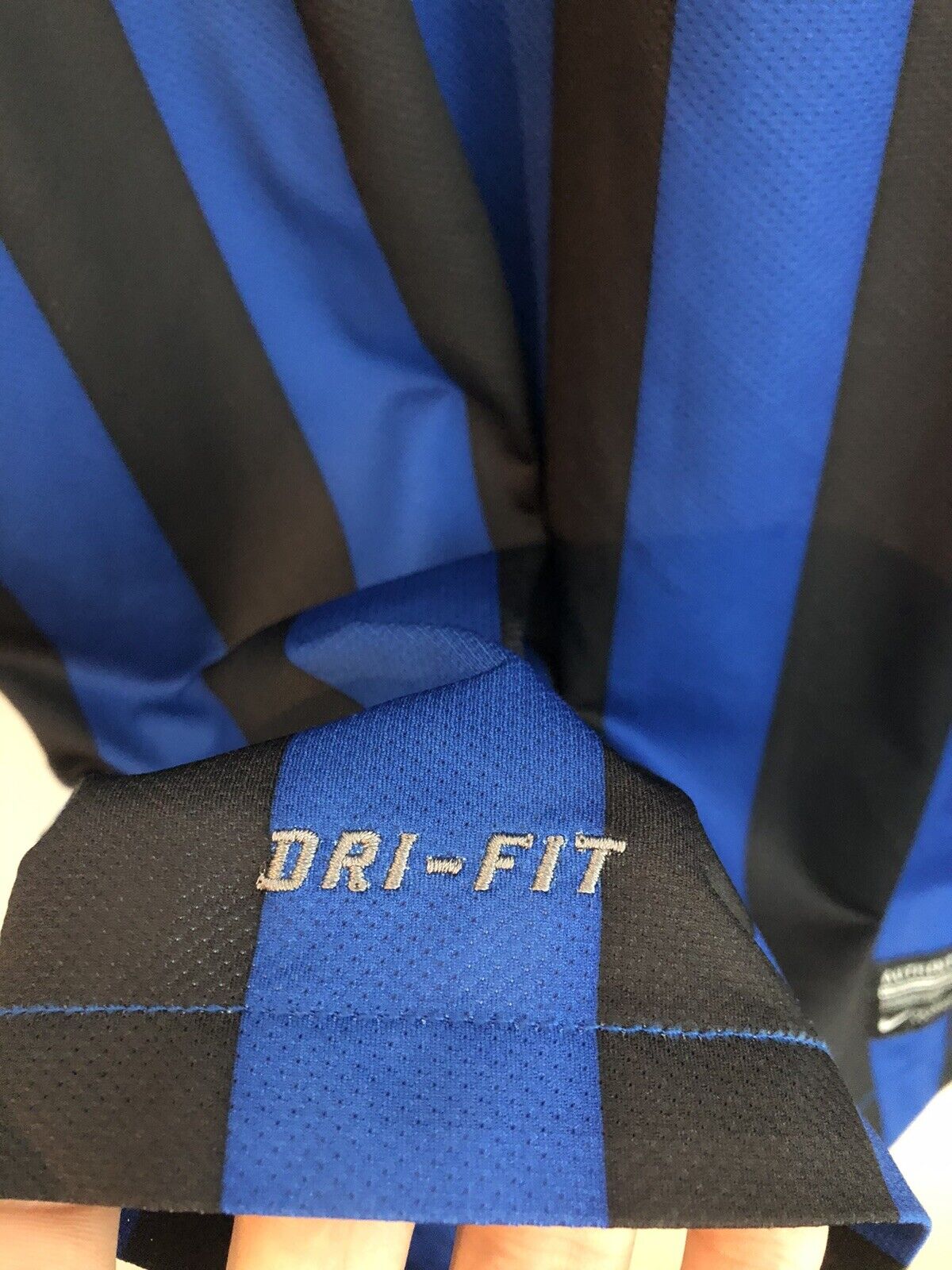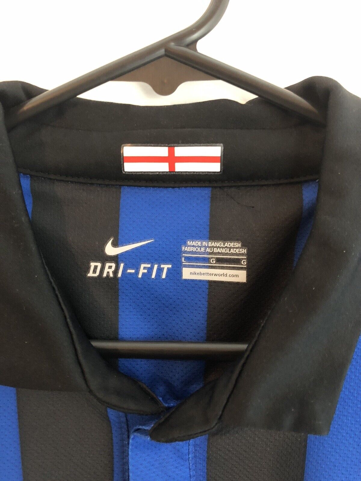 Show your support for Inter with this excellent condition 2011/12 home football shirt. The stylish blue & black shirt features short sleeves and a loose fit, making it suitable for adults in a size large. The shirt is made by Nike and has a product code of 419985 010, ensuring that you get a genuine item. This shirt has collar to hem measurements of 29 inches and pit to pit measurements of 22 inches. This shirt is suitable for wearing casually or at the match, so why not show your love for Inter by getting this shirt today.