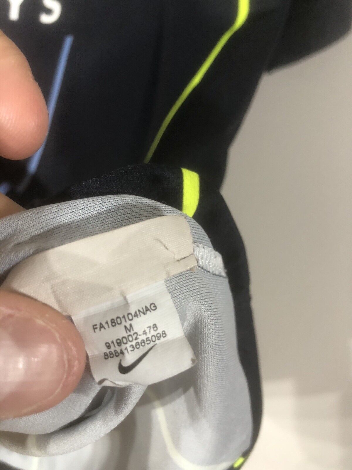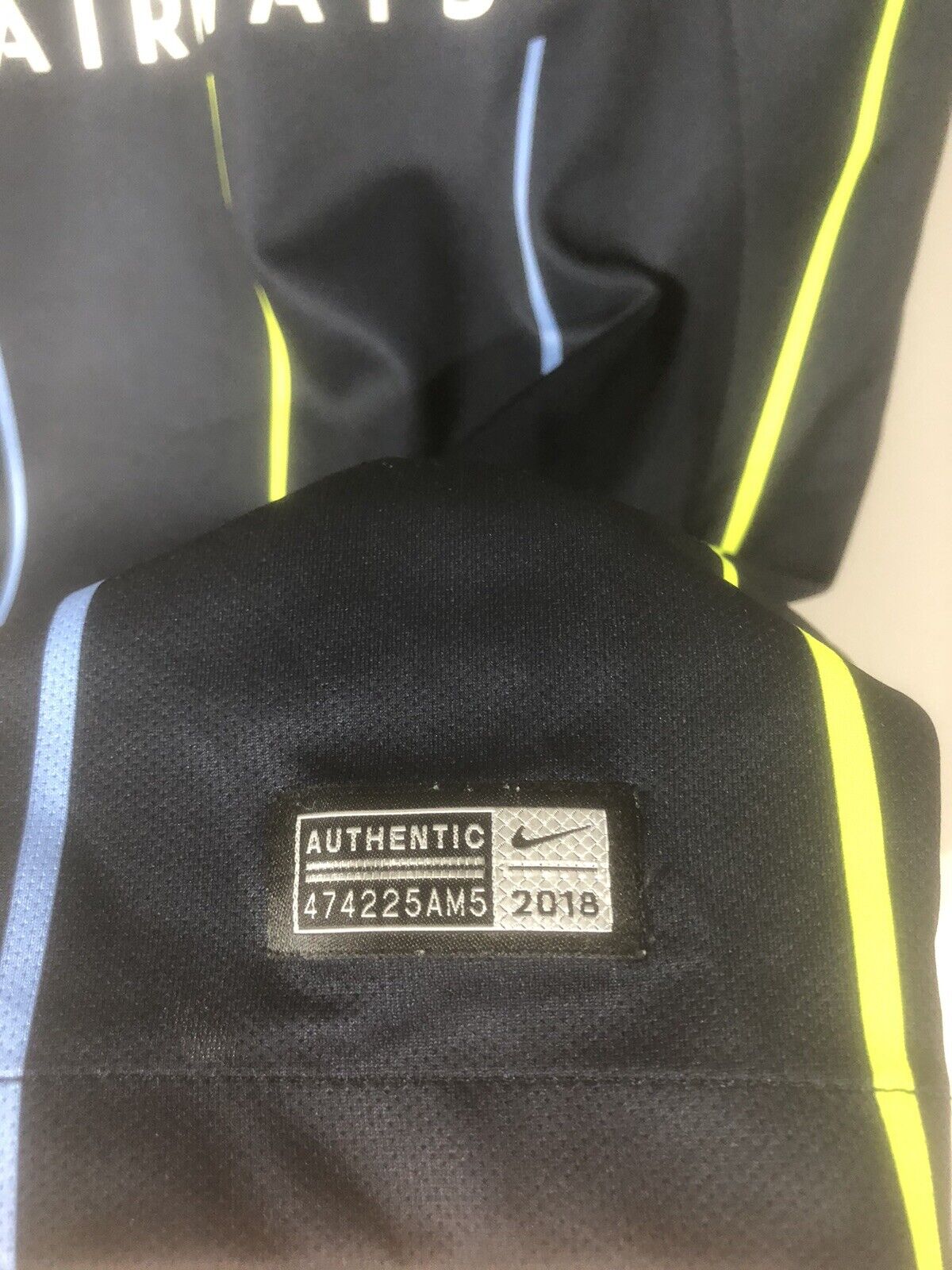 This is an excellent Manchester City away shirt from the 2018/19 season, featuring the number 4 and the name of legendary defender Vincent Kompany. The shirt has short sleeves and is a size medium, suitable for adults. It is a Nike brand shirt and has a black colour scheme.
