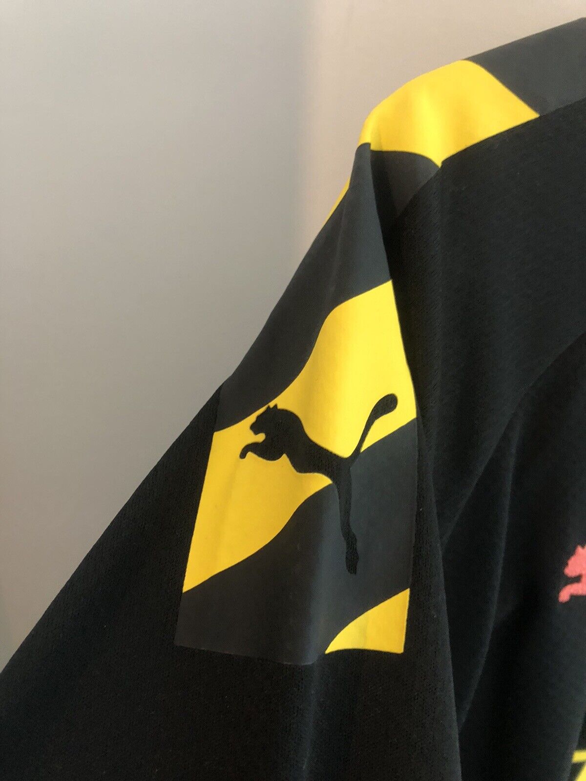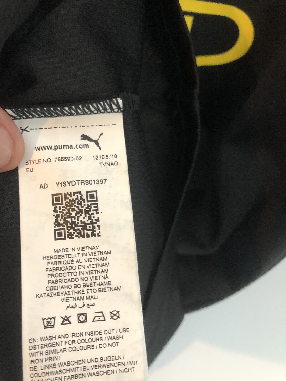 Show your support for Manchester City with this excellent condition PUMA Kun Aguero #10 2019/20 XL away football shirt. The striking black Hacienda design comes with short sleeves and a loose fit, making it suitable for adults around a size XL. The shirt is made by PUMA and has a product code of 755590-02, ensuring that you get a genuine item. This shirt has collar to hem measurements of 30 inches and pit to pit measurements of 22 inches. The shirt has an official Manchester City Kun Aguero #10 euro nameset. This shirt is suitable for wearing casually or at the match, so why not show your love for Manchester City by getting this shirt today.