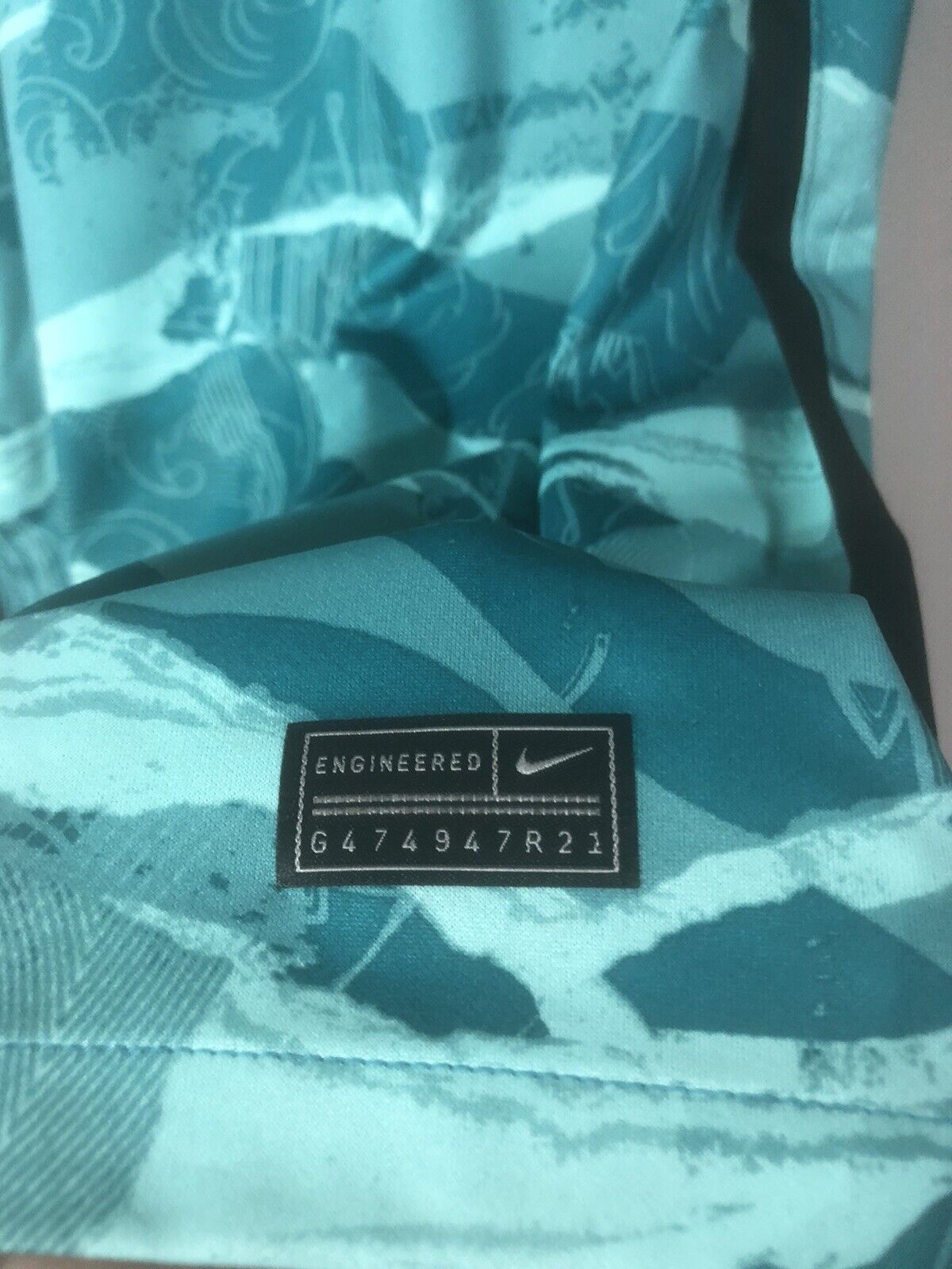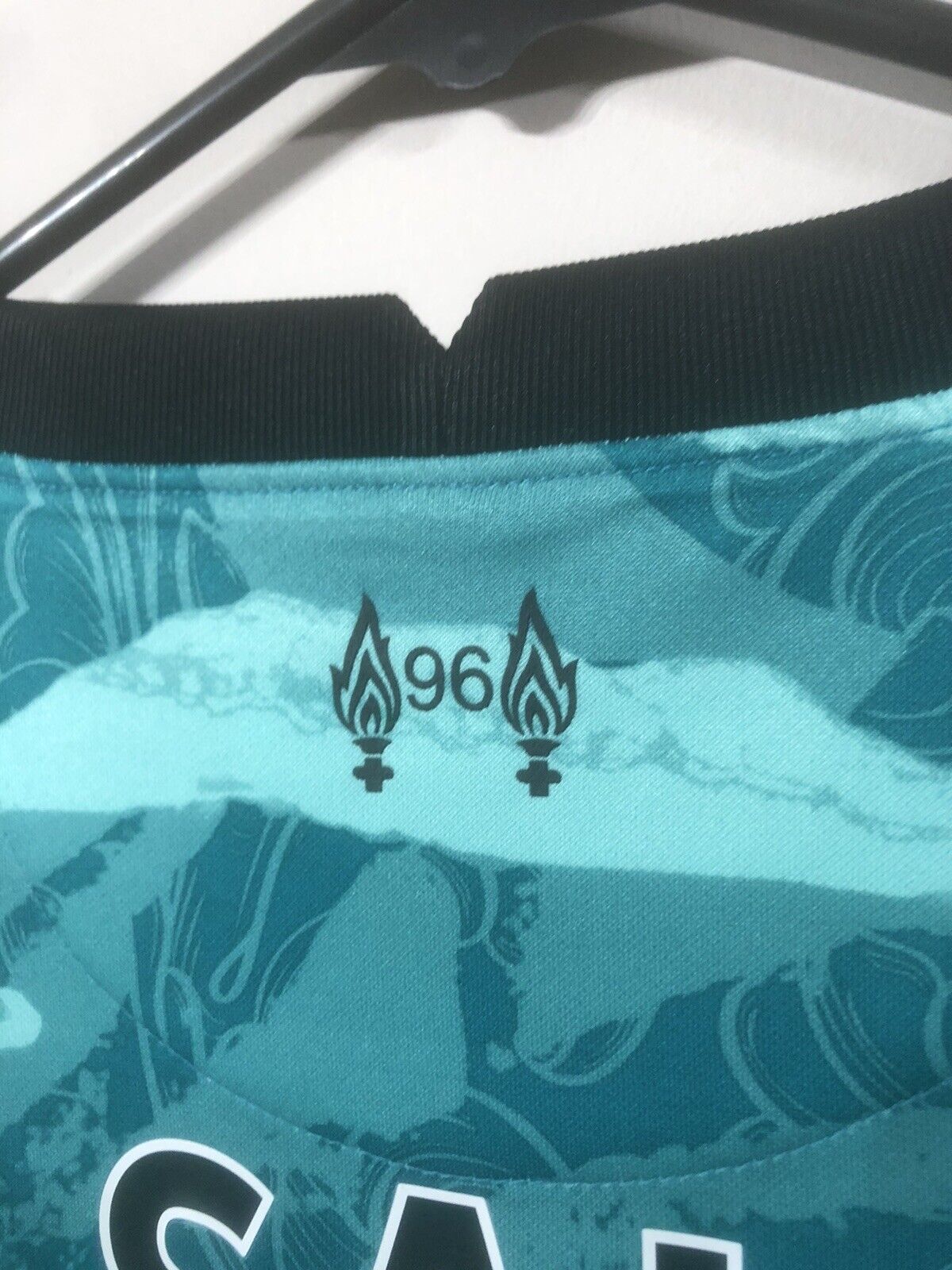 Show your support for Liverpool with this excellent condition M. Salah #11 2020/21 away football shirt. The green shirt features short sleeves and a loose fit, making it suitable for adults in a size medium. The shirt is made by Nike and has a product code of CZ2635-354, ensuring that you get a genuine item. This shirt has collar to hem measurements of 28 inches and pit to pit measurements of 20 inches. The shirt has an official Avery Dennison M. Salah #11 nameset and a player size official Premier League Champions patch. This shirt is suitable for wearing casually or at the match, so why not show your love for Liverpool by getting this shirt today.