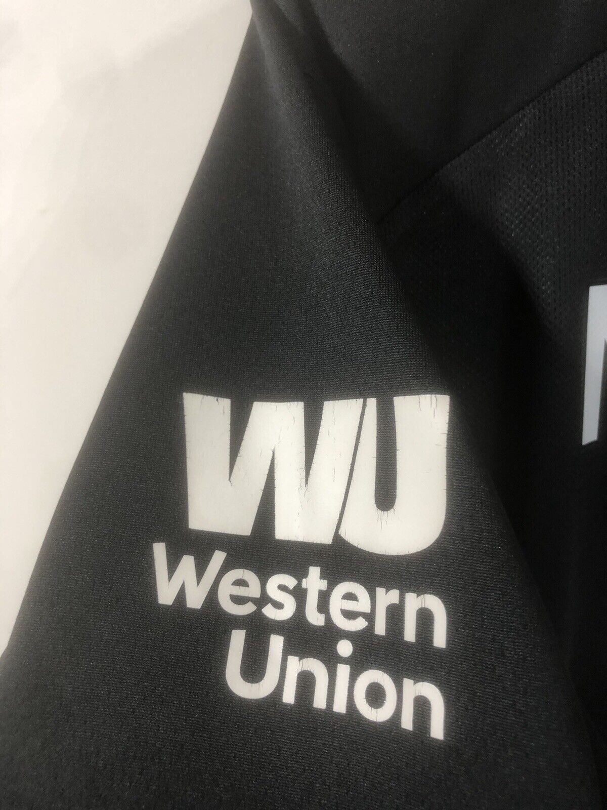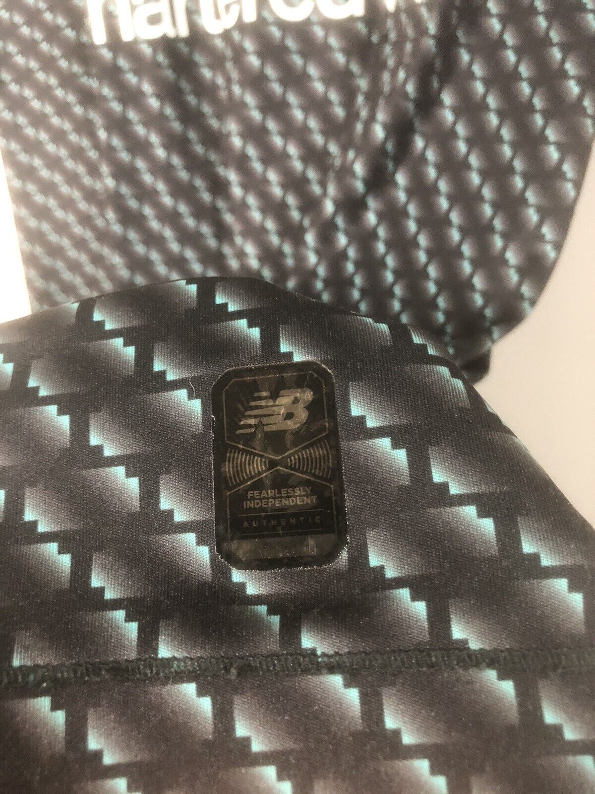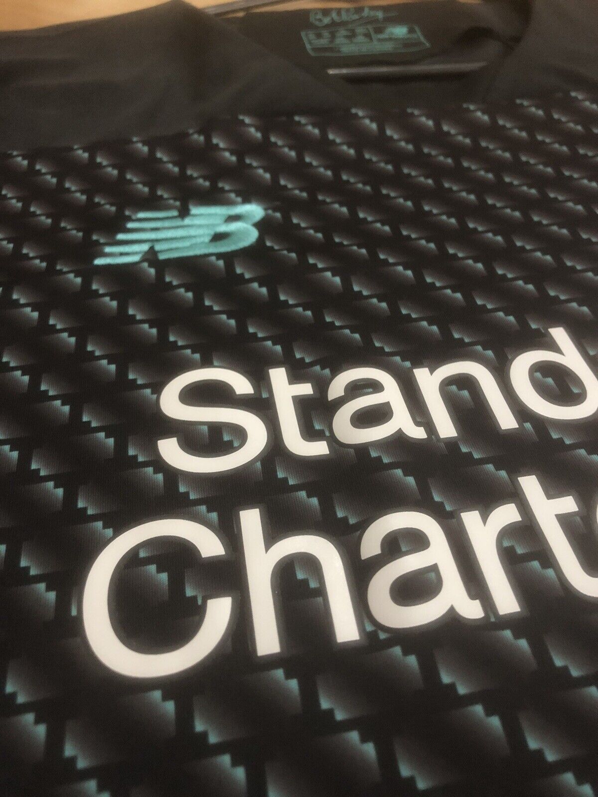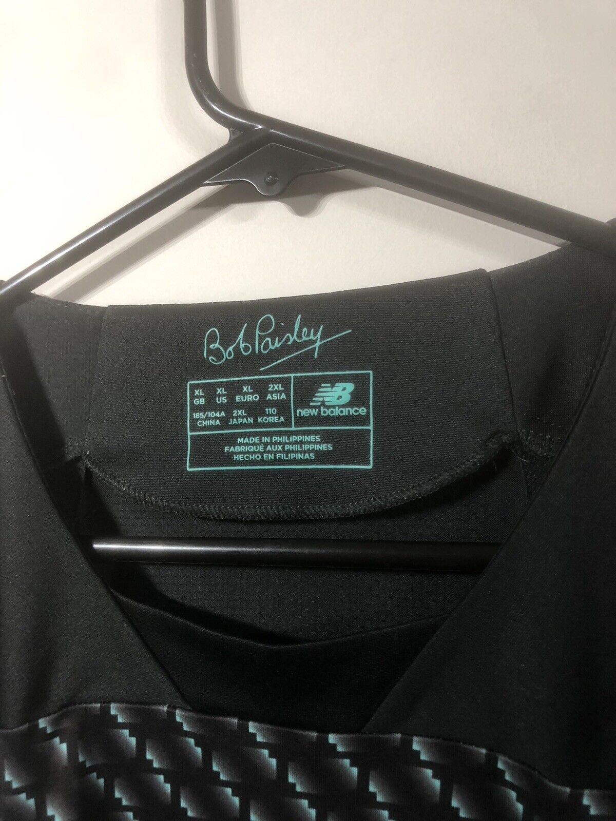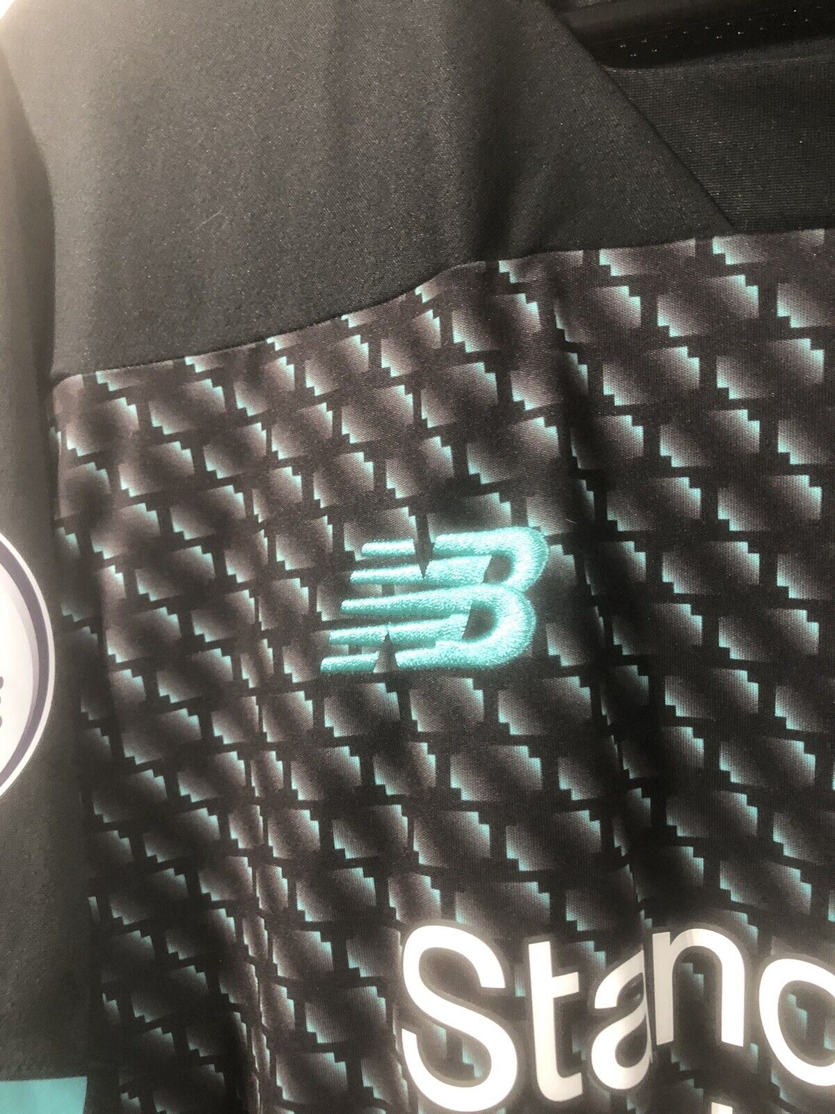 Show your support for Liverpool with this excellent condition M. Salah #11 2019/20 3rd football shirt. The stylish black shirt features short sleeves and a loose fit, making it suitable for adults in a size XL. The shirt is made by New Balance and has a product code of MT930023, ensuring that you get a genuine item. This shirt has collar to hem measurements of 30 inches and pit to pit measurements of 23 inches. The shirt has a official Liverpool M. Salah #11 nameset and an official Premier League patch. This shirt is suitable for wearing casually or at the match, so why not show your love for Liverpool by getting this shirt today.