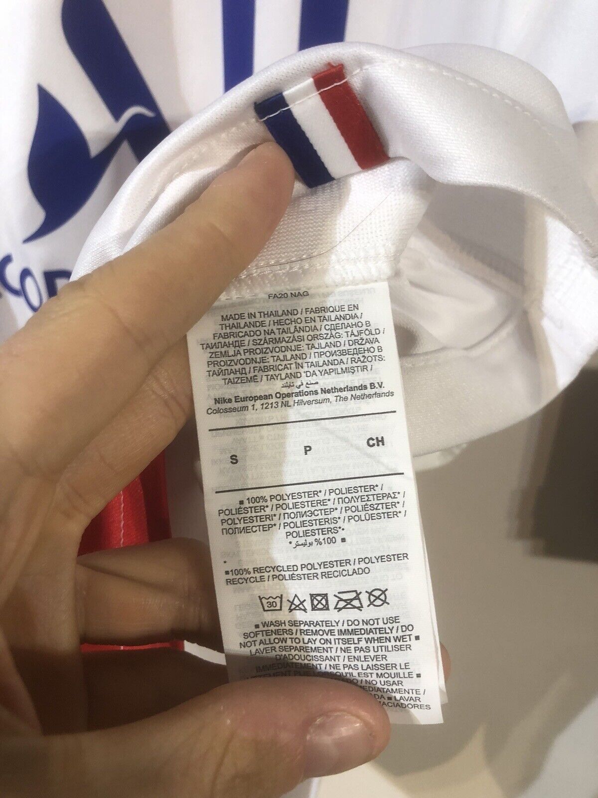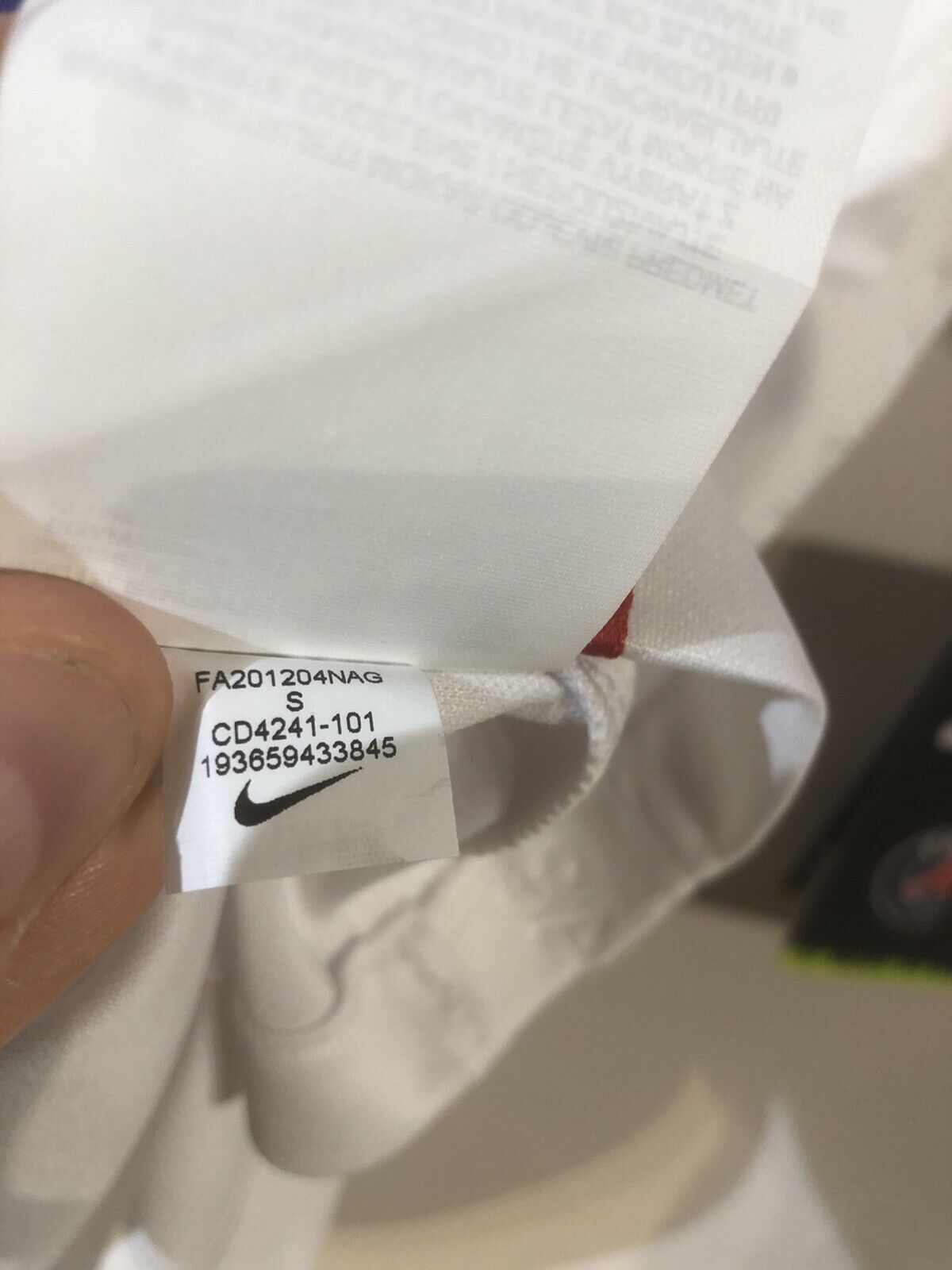 Show your support for Paris Saint-Germain with this brand new 2020/21 away shirt, featuring the iconic number 7 of Kylian Mbappe. Made by Nike and in size small, this shirt is perfect for adult fans of the French club. The short-sleeved shirt is in the main colour of white, with the Paris Saint-Germain crest and Nike logo proudly displayed.