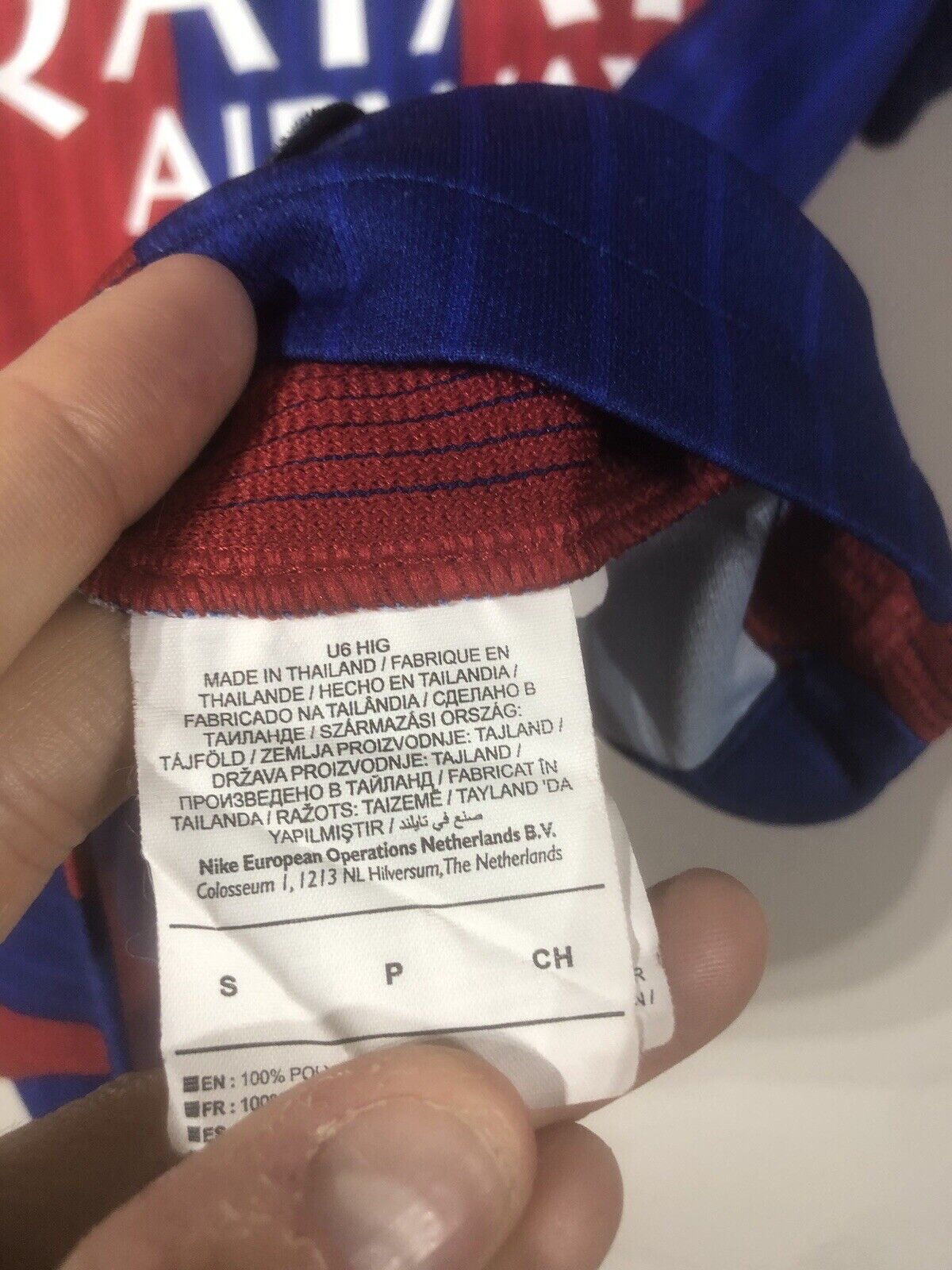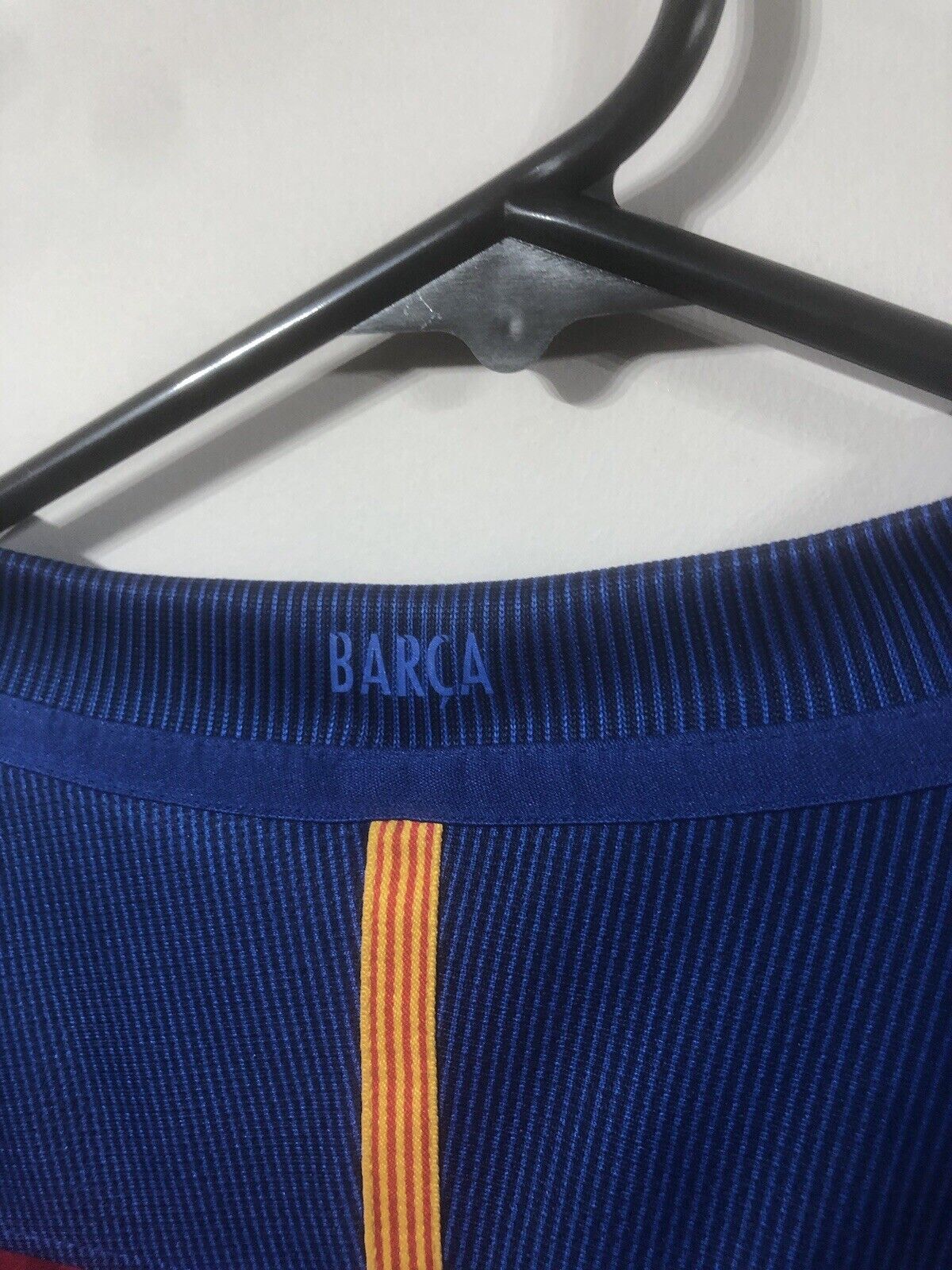 Show your support for Barcelona with this excellent condition Messi #10 2016/17 home football shirt. The shirt features short sleeves and a loose fit, making it suitable for adults in a size small. The shirt is made by Nike and has a product code of 776850-481, ensuring that you get a genuine item. This shirt has collar to hem measurements of 27 inches and pit to pit measurements of 19 inches. The shirt has an official Messi #10 nameset. This shirt is suitable for wearing casually or at the match, so why not show your love for Barcelona by getting this shirt today.