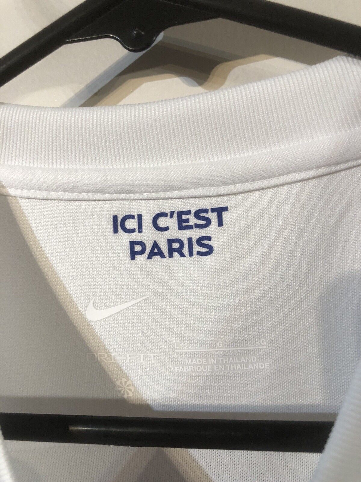 Get your hands on the latest Paris Saint-Germain away shirt for the 2022/23 season, featuring the iconic number 30 and Lionel Messi's name on the back. This large-sized shirt from Nike is perfect for adult fans looking to show their support for the French club. The short-sleeved shirt comes in a crisp white colour and is a great addition to any football memorabilia collection. It has been modified with Messi #30 nameset and is in excellent condition, making it a must-have item for any PSG or Messi fan.