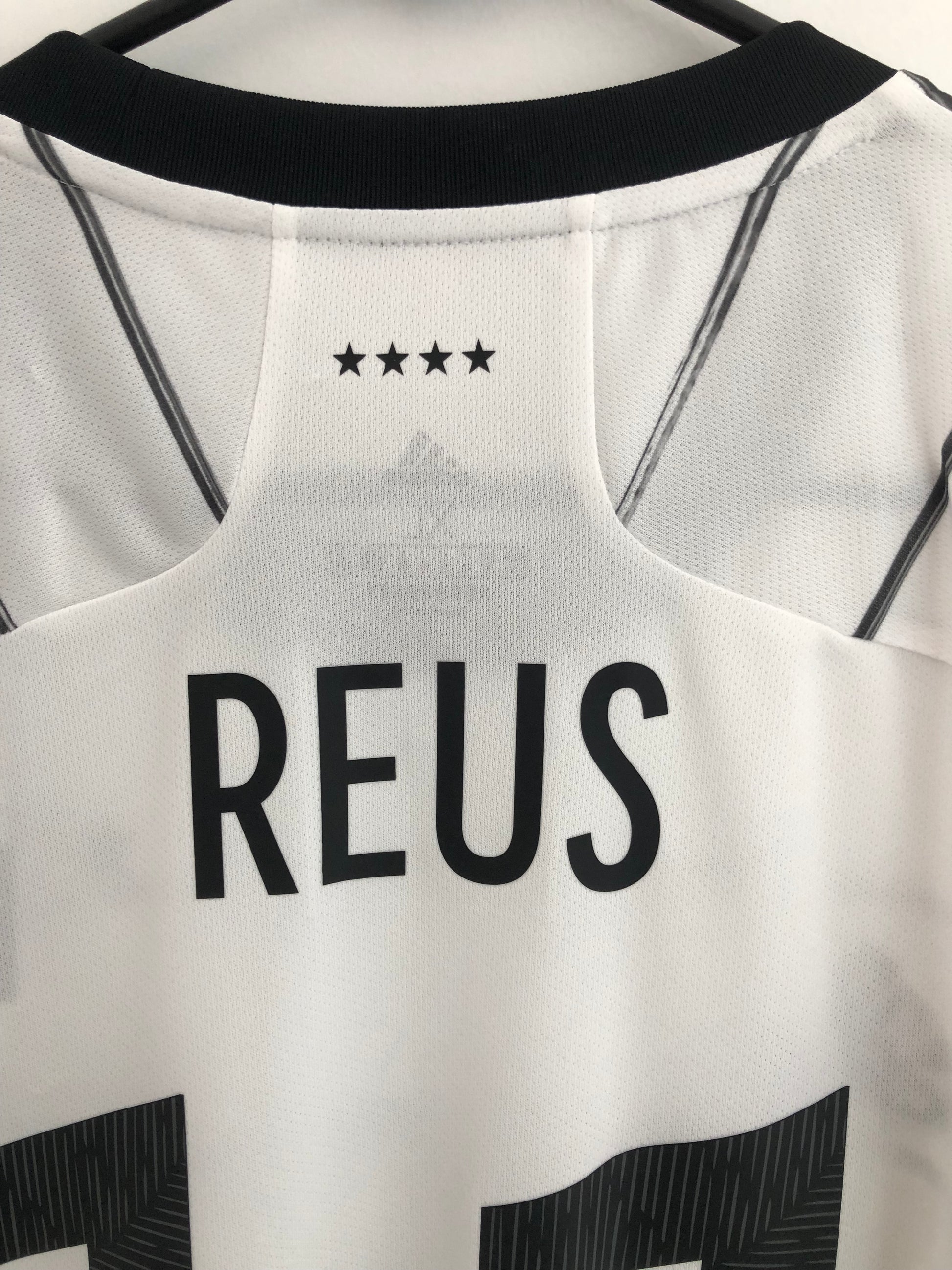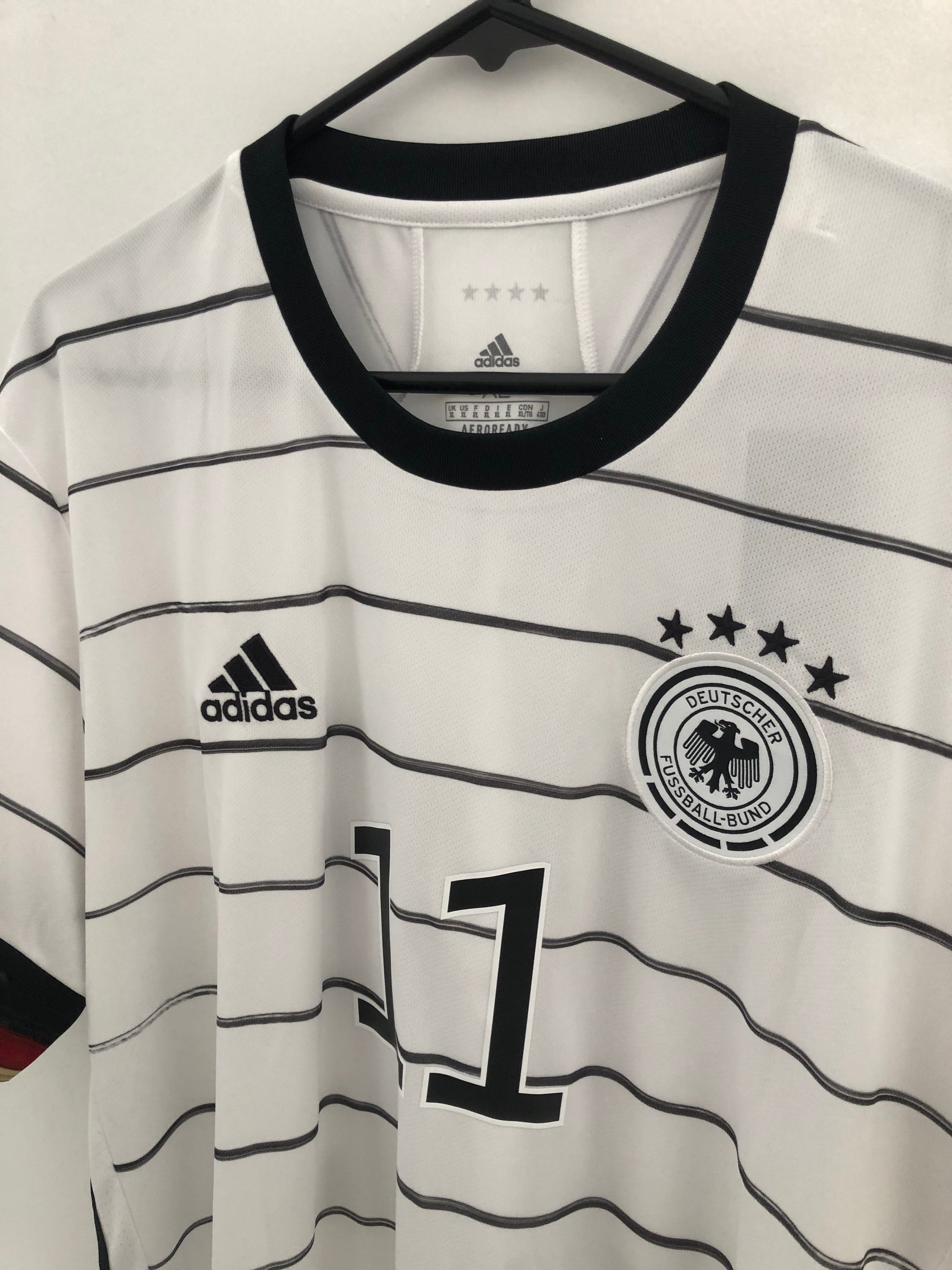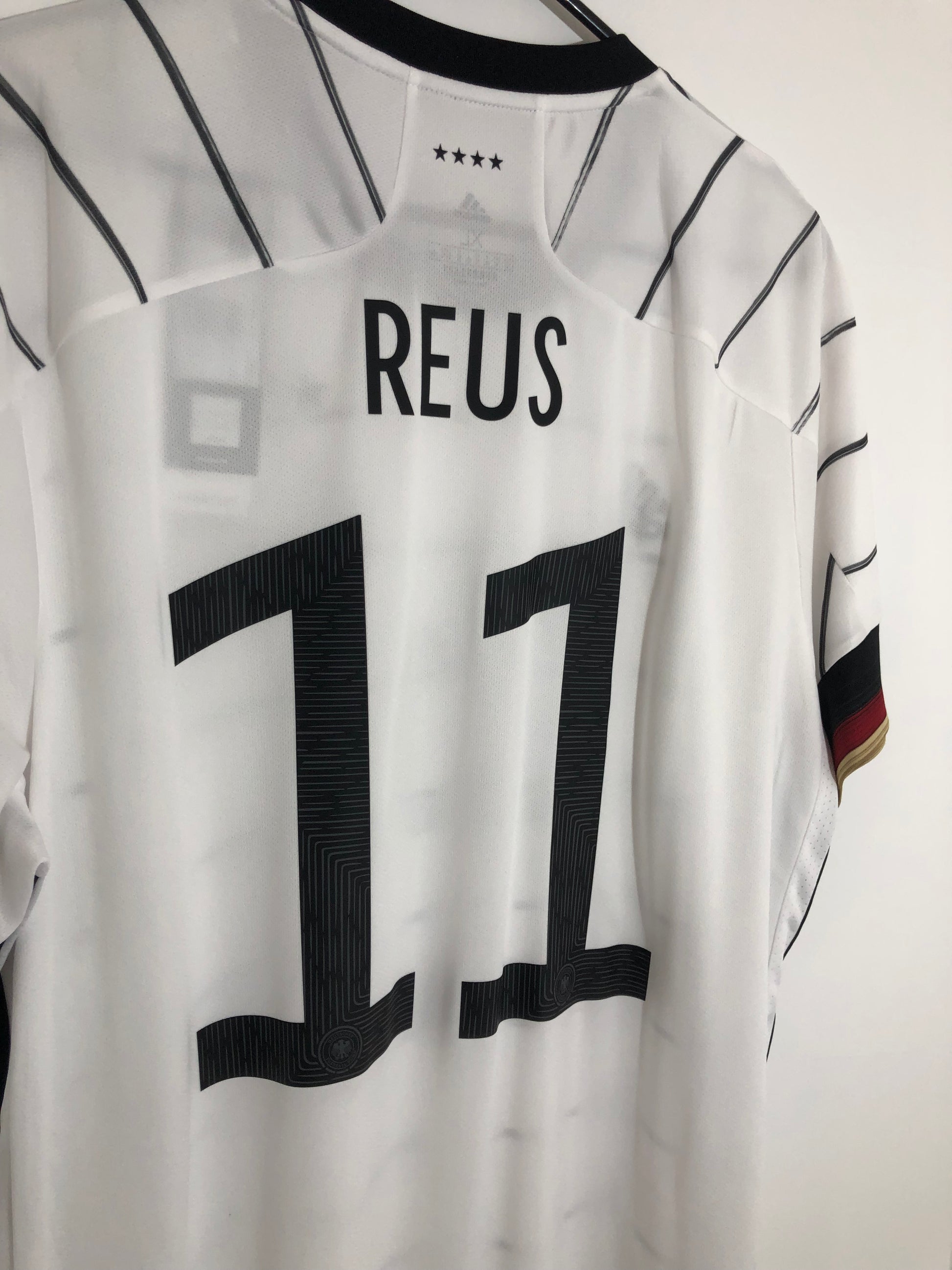Show your support for the German national team with this brand new Reus #11 2020 home football shirt. The black & white shirt features short sleeves and a loose fit, making it suitable for adults in a size XL. The shirt is made by Adidas and has a product code of EH6105, ensuring that you get a genuine item. This shirt has collar to hem measurements of 30 inches and pit to pit measurements of 23 inches. The shirt has a Reus #11 nameset. This shirt is suitable for wearing casually or at the match, so why not show your love for Germany by getting this shirt today.