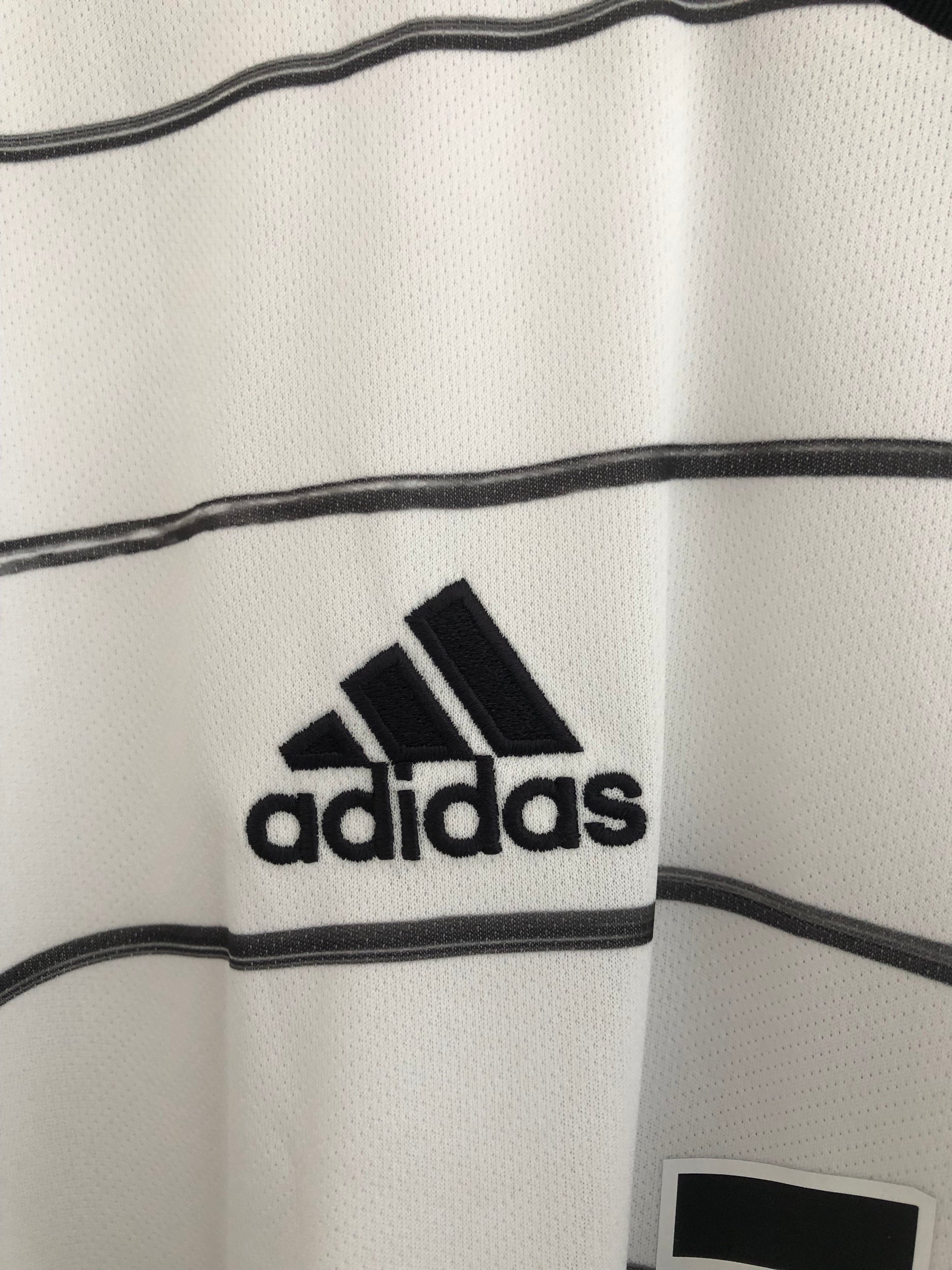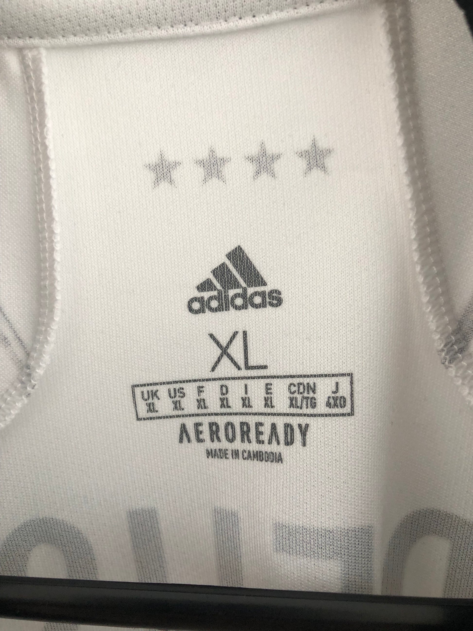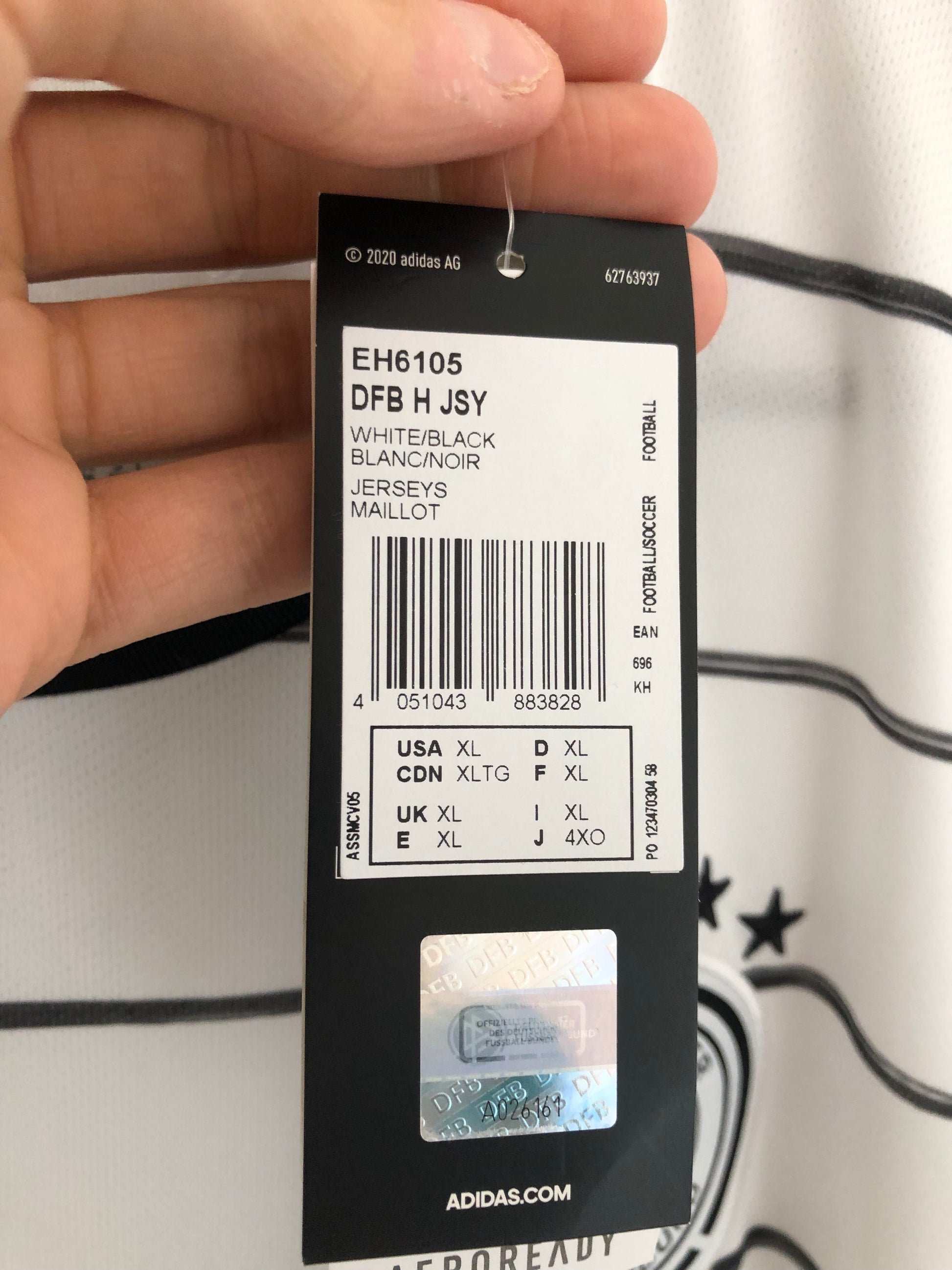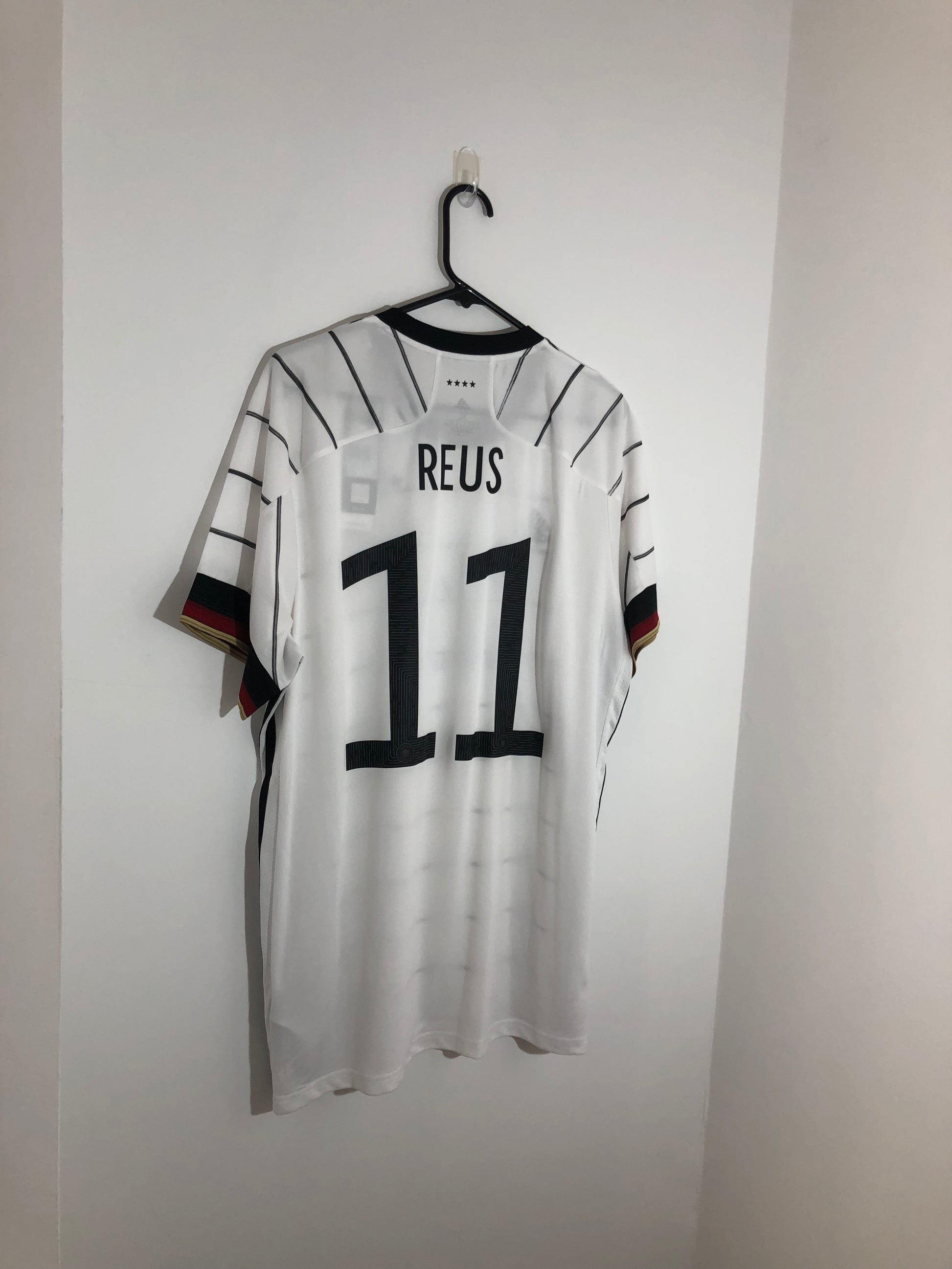 Show your support for the German national team with this brand new Reus #11 2020 home football shirt. The black & white shirt features short sleeves and a loose fit, making it suitable for adults in a size XL. The shirt is made by Adidas and has a product code of EH6105, ensuring that you get a genuine item. This shirt has collar to hem measurements of 30 inches and pit to pit measurements of 23 inches. The shirt has a Reus #11 nameset. This shirt is suitable for wearing casually or at the match, so why not show your love for Germany by getting this shirt today.