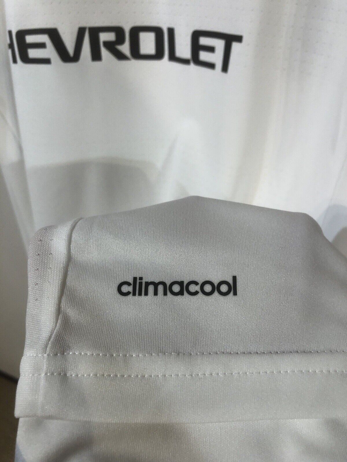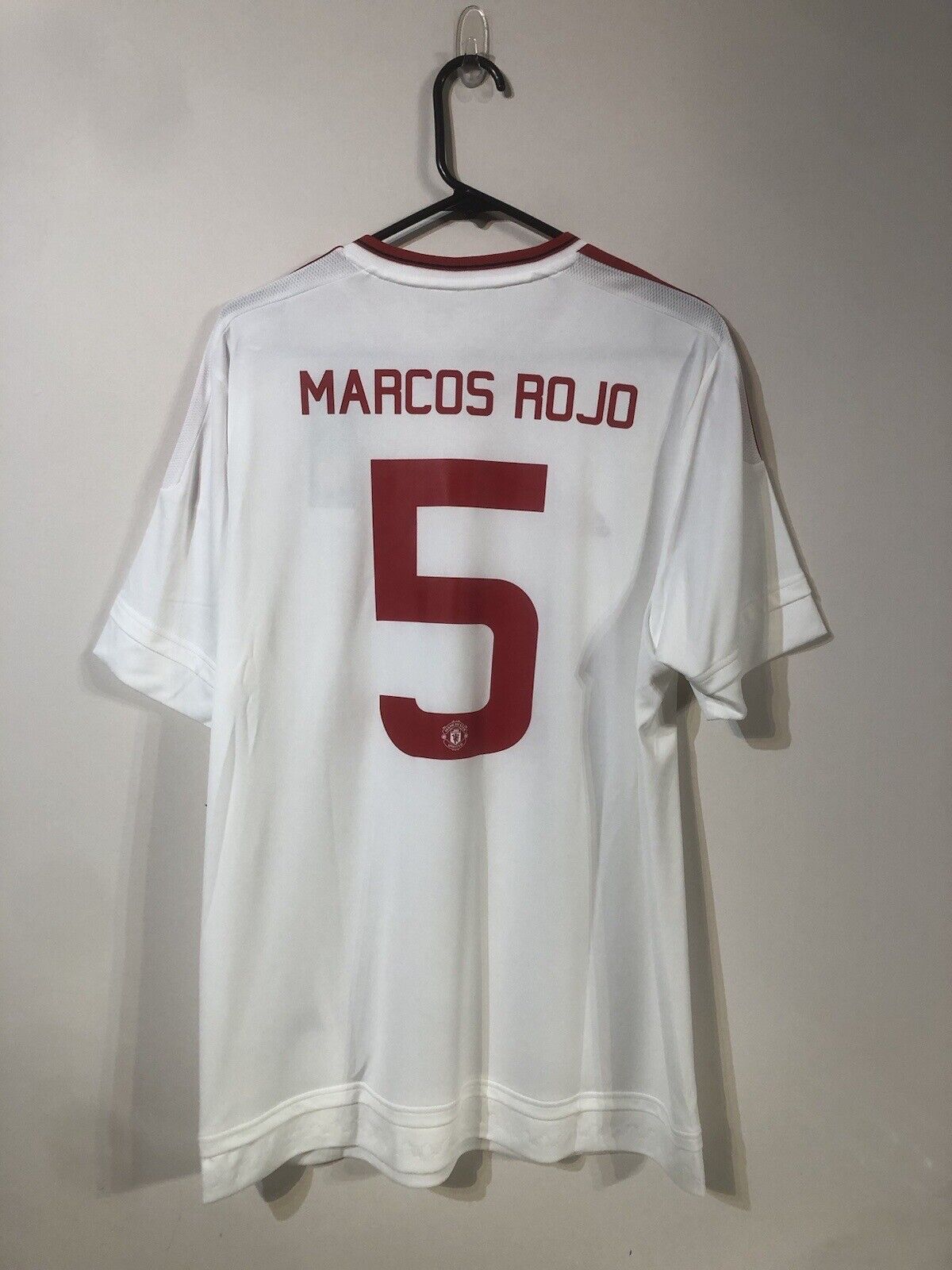This Manchester United 2015/16 away football shirt is perfect for any fan of the Red Devils. It features the name and number of Marcus Rojo with the Rojo #5 nameset on the back, as well as short sleeves and a large size. The kit is made by adidas and is suitable for adults, with a white main colour and the English club's crest proudly displayed on the front.