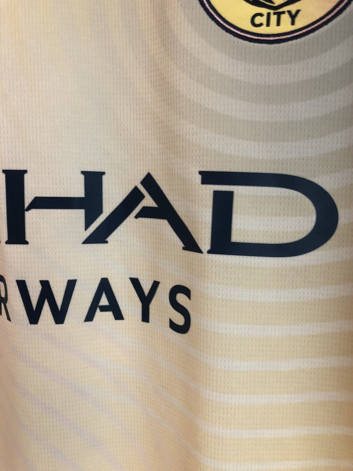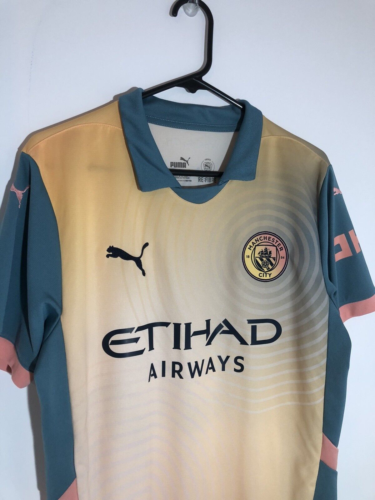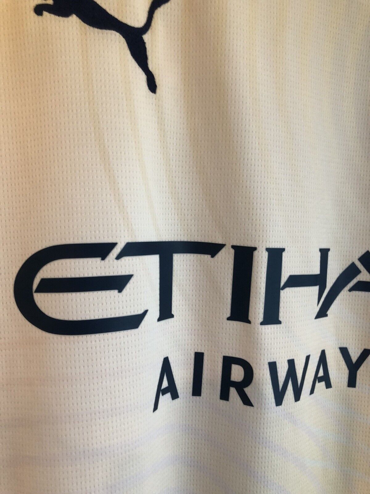 Show your support for Manchester City with this excellent condition Savinho #26 2024/25 4th football shirt. The stylish yellow shirt features short sleeves and a loose fit, making it suitable for adults in a size medium. The shirt is made by Puma and has a product code of 775202-04, ensuring that you get a genuine item. This shirt has collar to hem measurements of 28 inches and pit to pit measurements of 21 inches. This shirt is suitable for wearing casually or at the match, so why not show your love for Manchester City by getting this shirt today.