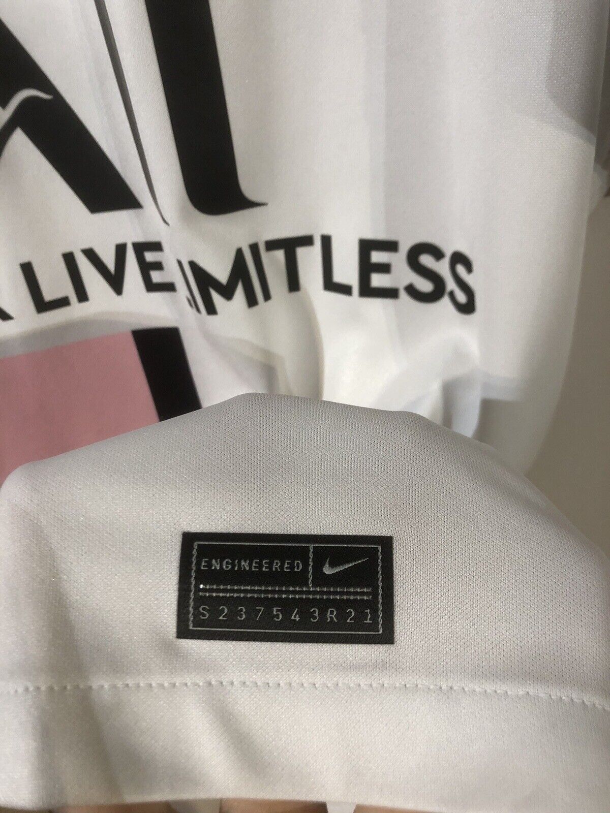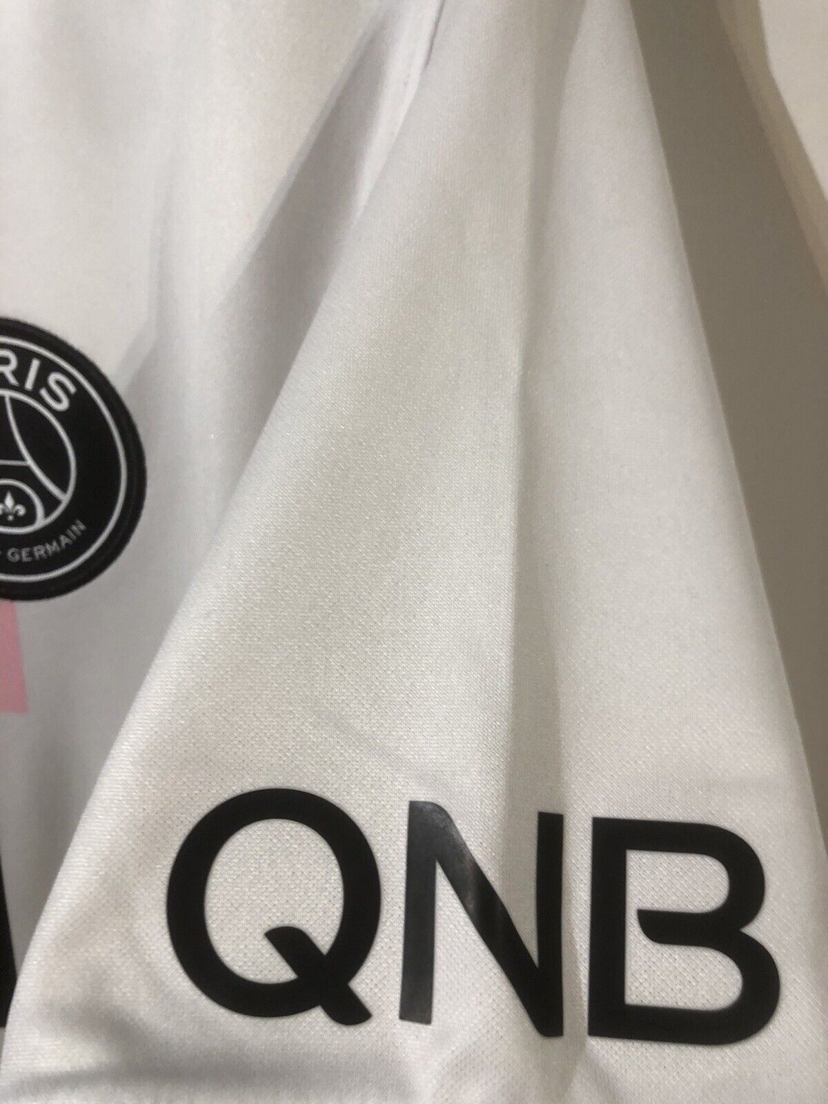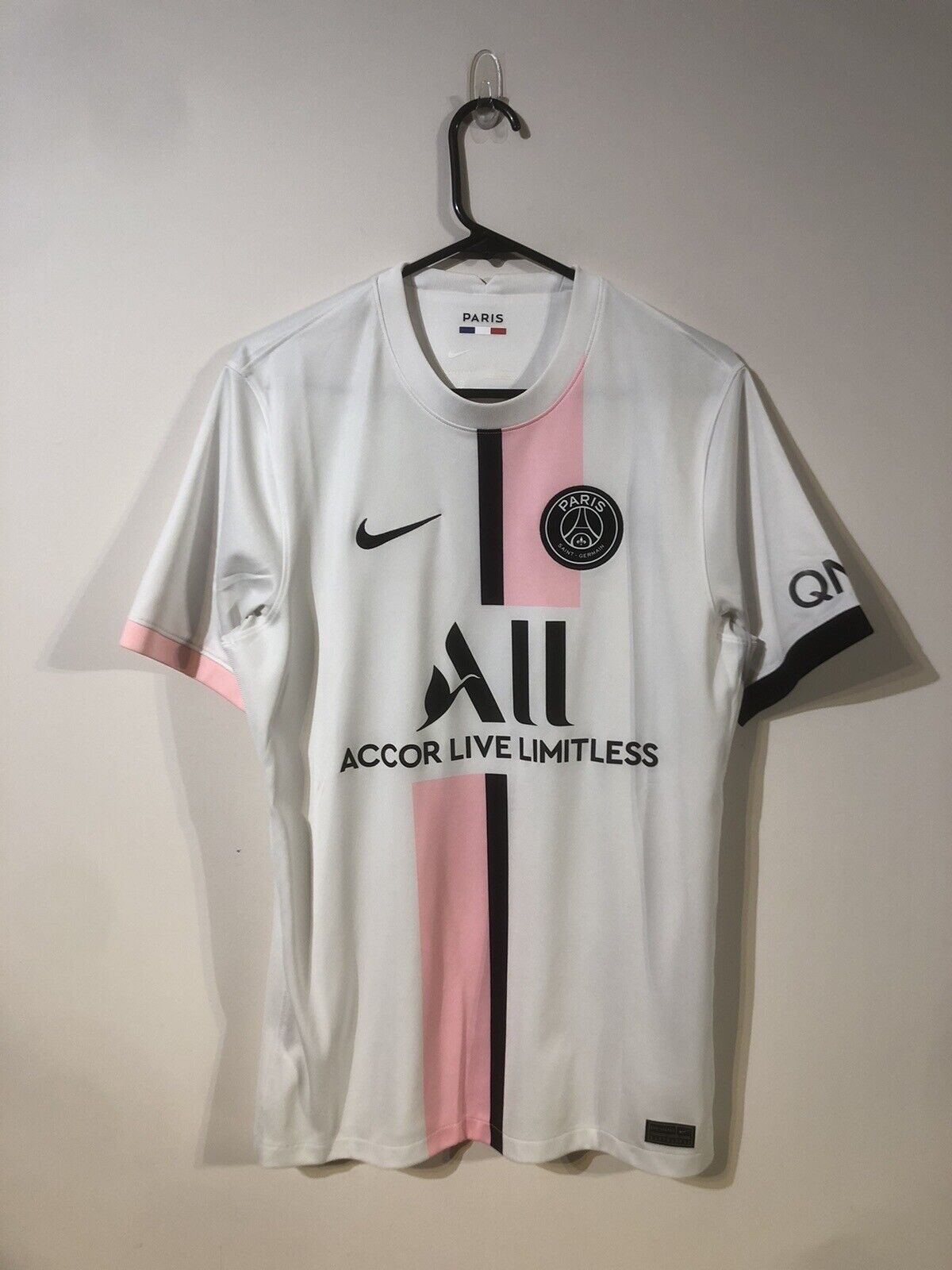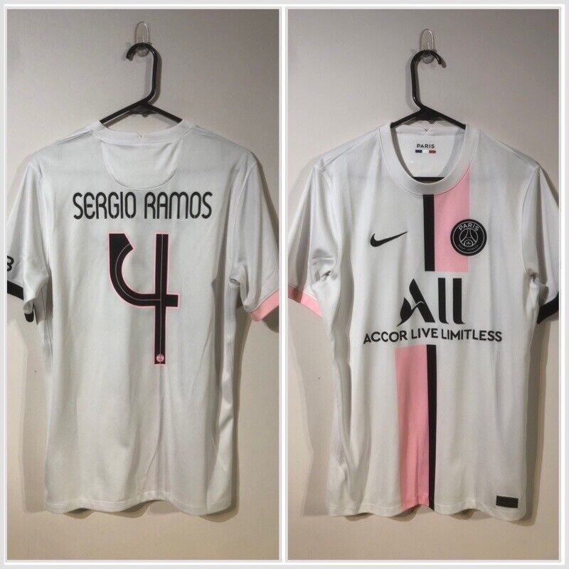 Show your support for Paris Saint-Germain and Sergio Ramos with this classic medium-sized away shirt from the 2021/22 season. The shirt features a sleek white design with short sleeves and the number 4 on the back. The nameset is customised with Sergio Ramos' name and is in excellent condition, making it the perfect addition to any football fan's collection.