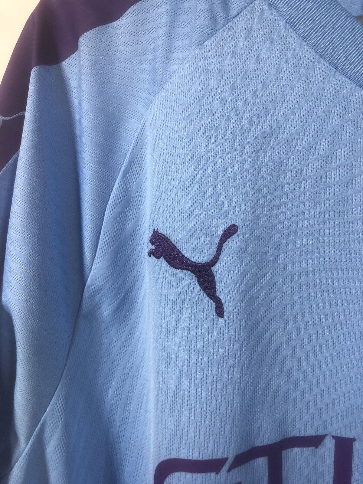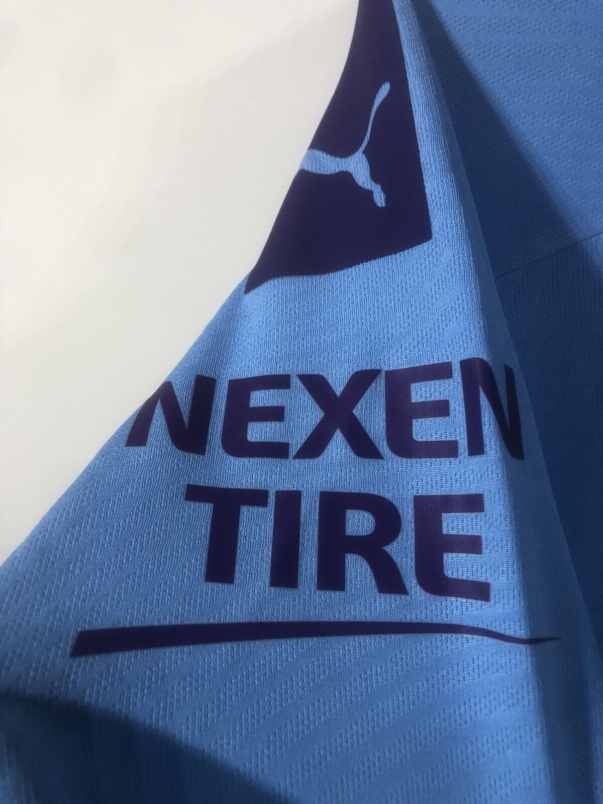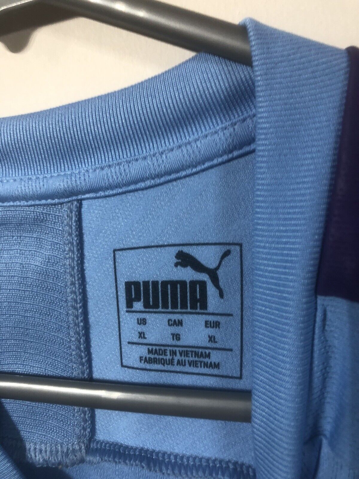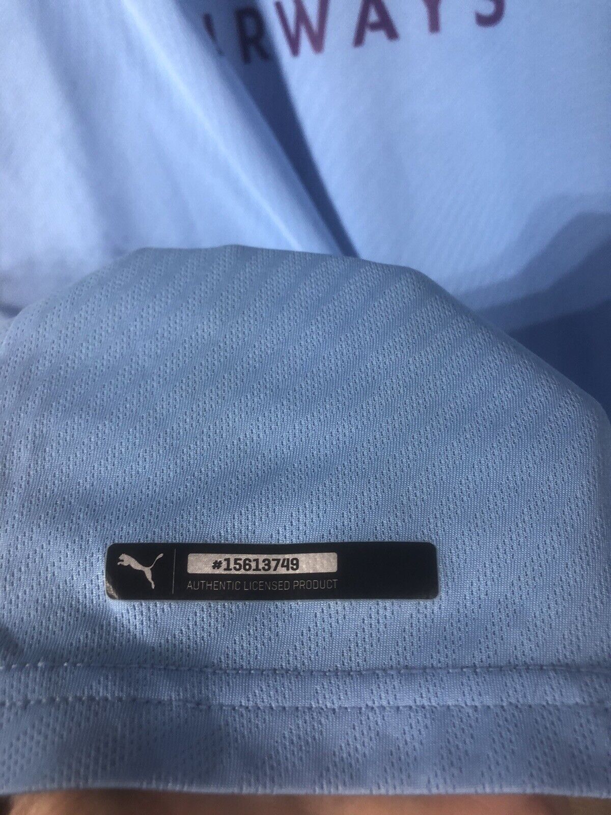 Show your support for Manchester City with this excellent condition Silva #21 Euro 2019/20 XL home shirt. The stylish blue shirt features short sleeves and a loose fit, making it suitable for adults in a size XL. The shirt is made by PUMA and has a product code of 755586-01, ensuring that you get a genuine item. This shirt has collar to hem measurements of 29 inches and pit to pit measurements of 22 inches. The shirt has a official Silva #21 Euro nameset and official Champions League patch. This shirt is suitable for wearing casually or at the match, so why not show your love for Manchester City by getting this shirt today.