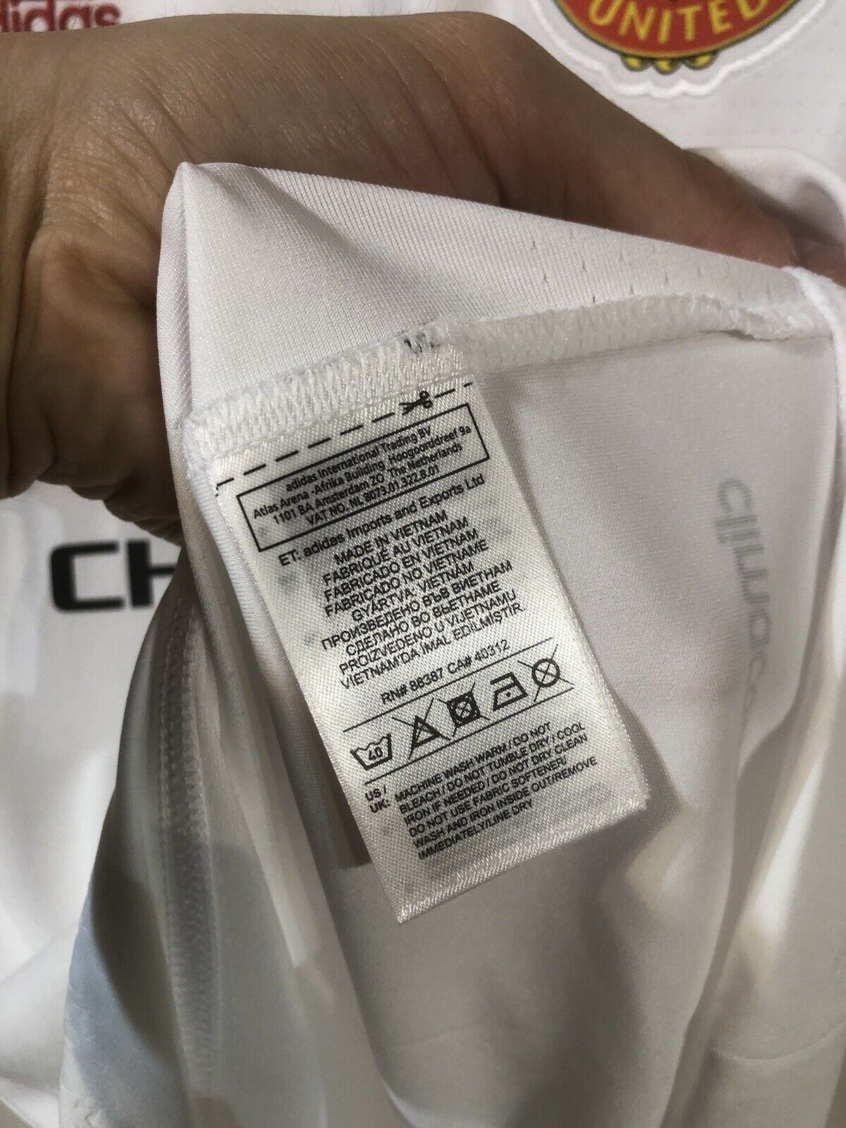 This Manchester United 2015/16 away football shirt is perfect for any fan of the Red Devils. It features the name and number of Chris Smalling with Smalling #12 nameset on the back, as well as short sleeves and a medium size. The kit is made by adidas and is suitable for adults, with a white main colour and the English club's crest proudly displayed on the front.